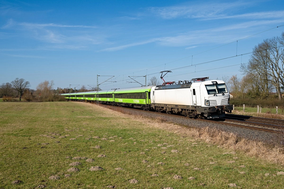 Dto. 193 436-3 am 11.04.2025 bei Bückeburg (HBKB) mit dem Flix 30 von Köln Hbf