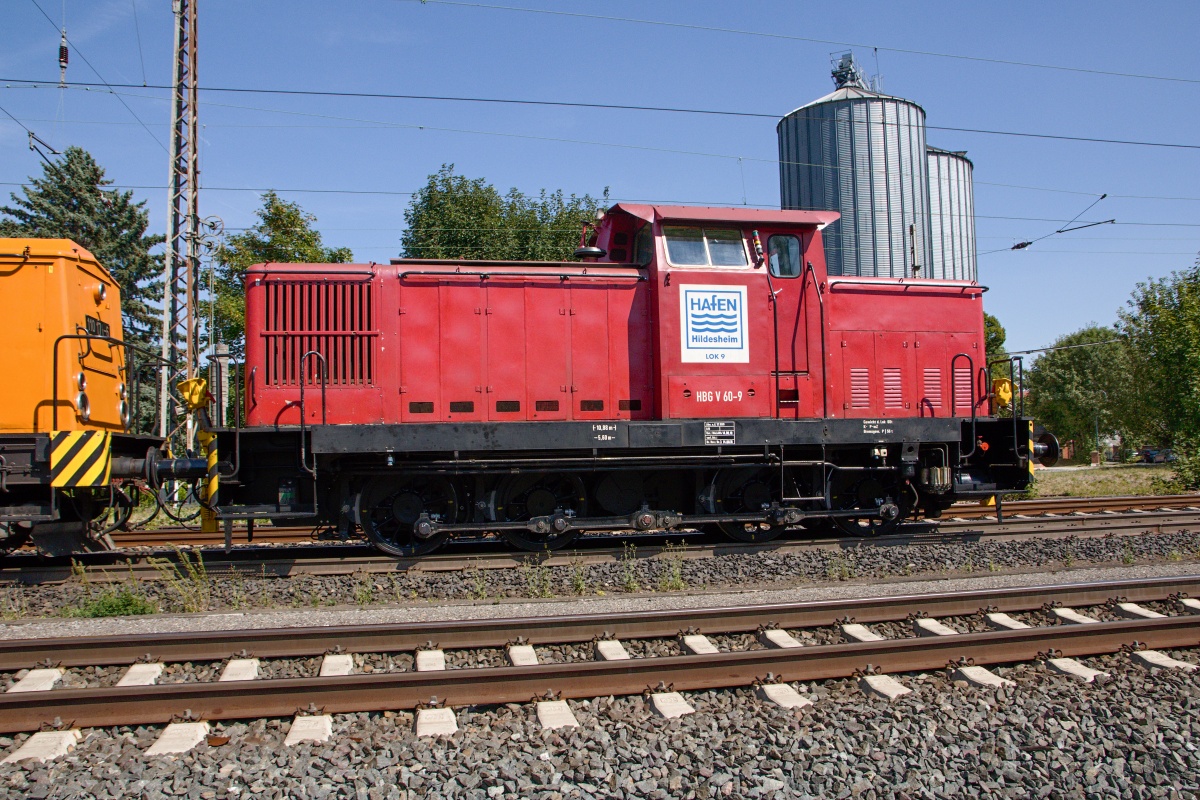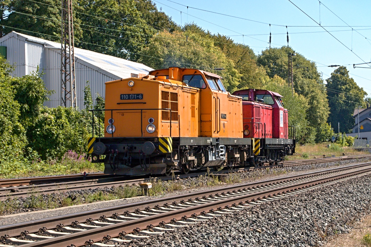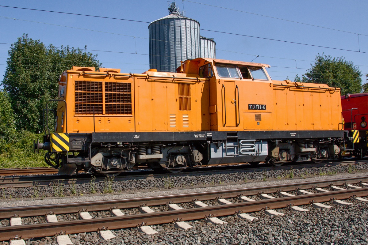 110 171-6 (NVR: 92 80 1201 171-6 D-TSE) war hier am 16.08.2018 mit HGB V 60-9 in Banteln Rtg. Norden/Hildesheim unterwegs... Die 110 171-6 seitlich... Die V 60-9 seitlich -- Fabriknummer 11973