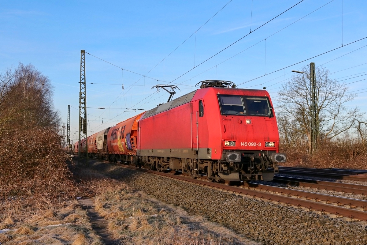 Dto. 145 092-3 im Morgenlicht am 23.02.2024 bei Porta-Westfalica (HPTH)