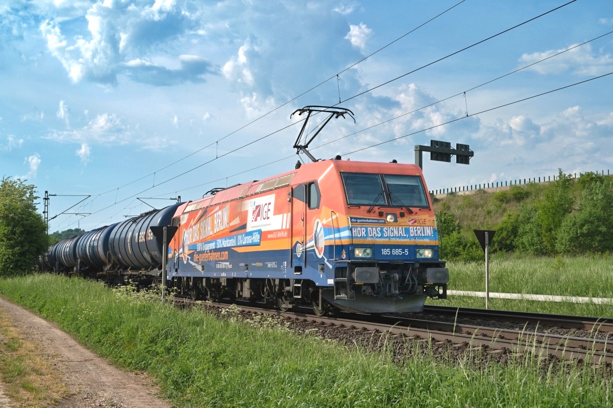 bei Altheim (FAT) mit Wagenlok 185 685-5 "Hör das Signal, Berlin" und