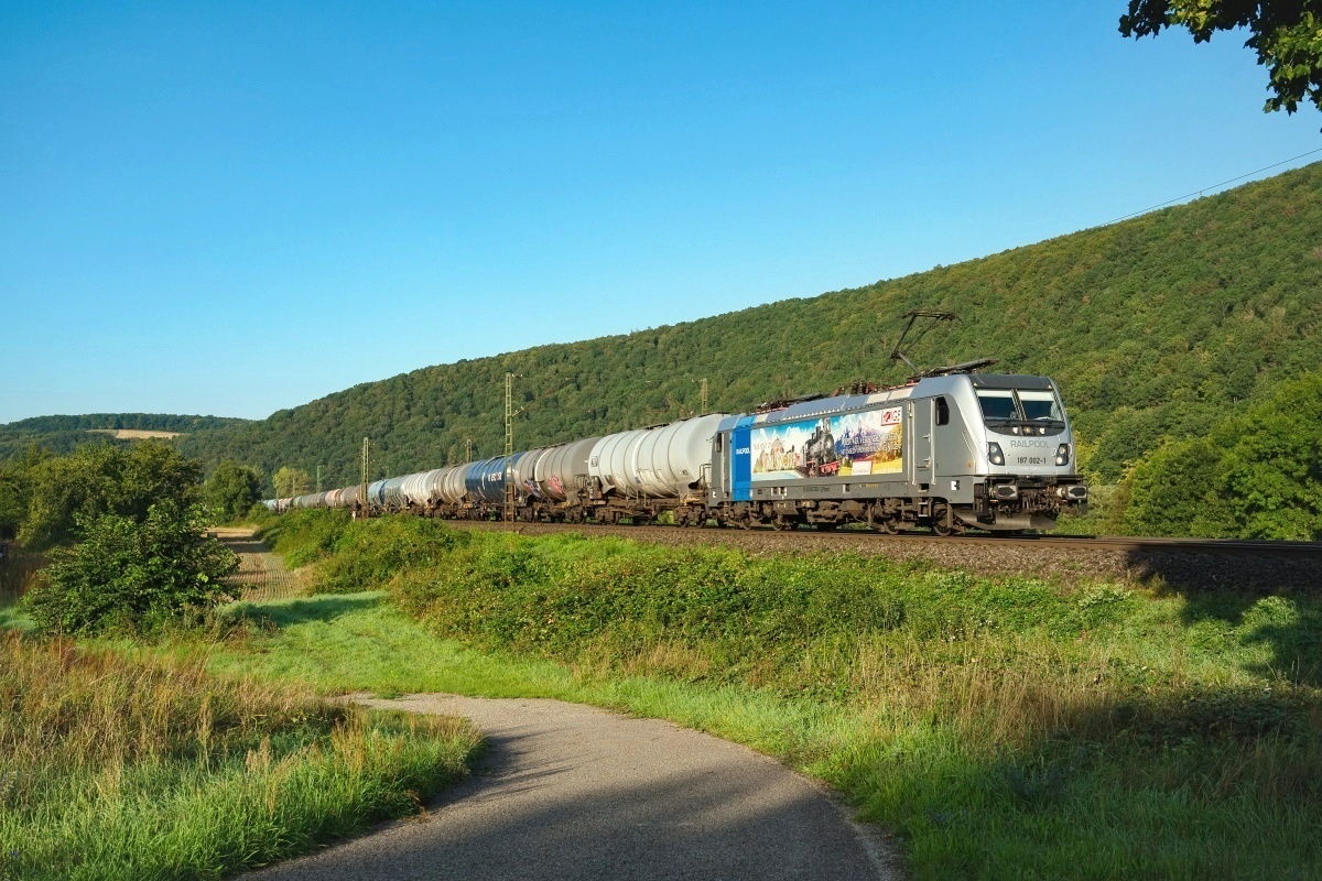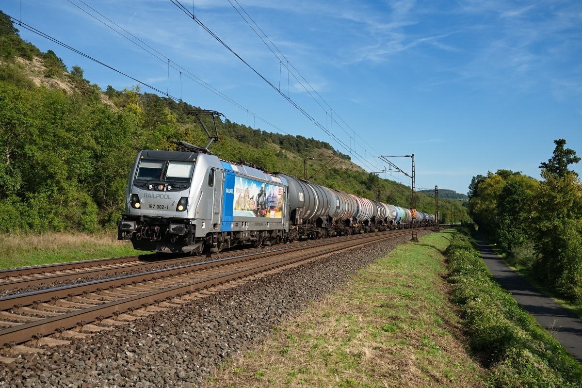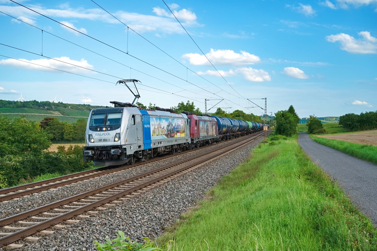 Dto. 187 002-1 am 11.08.2023 bei Gambach (Main) mit dem Kesselwagen DGS