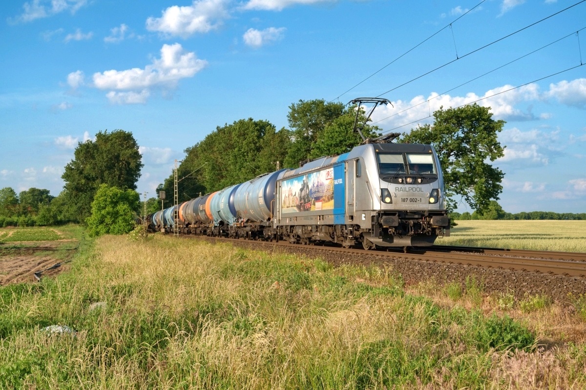 Dto. 187 002-1 am 15.08.2023 bei Winterhausen (NWN) mit Wagenlok 482
