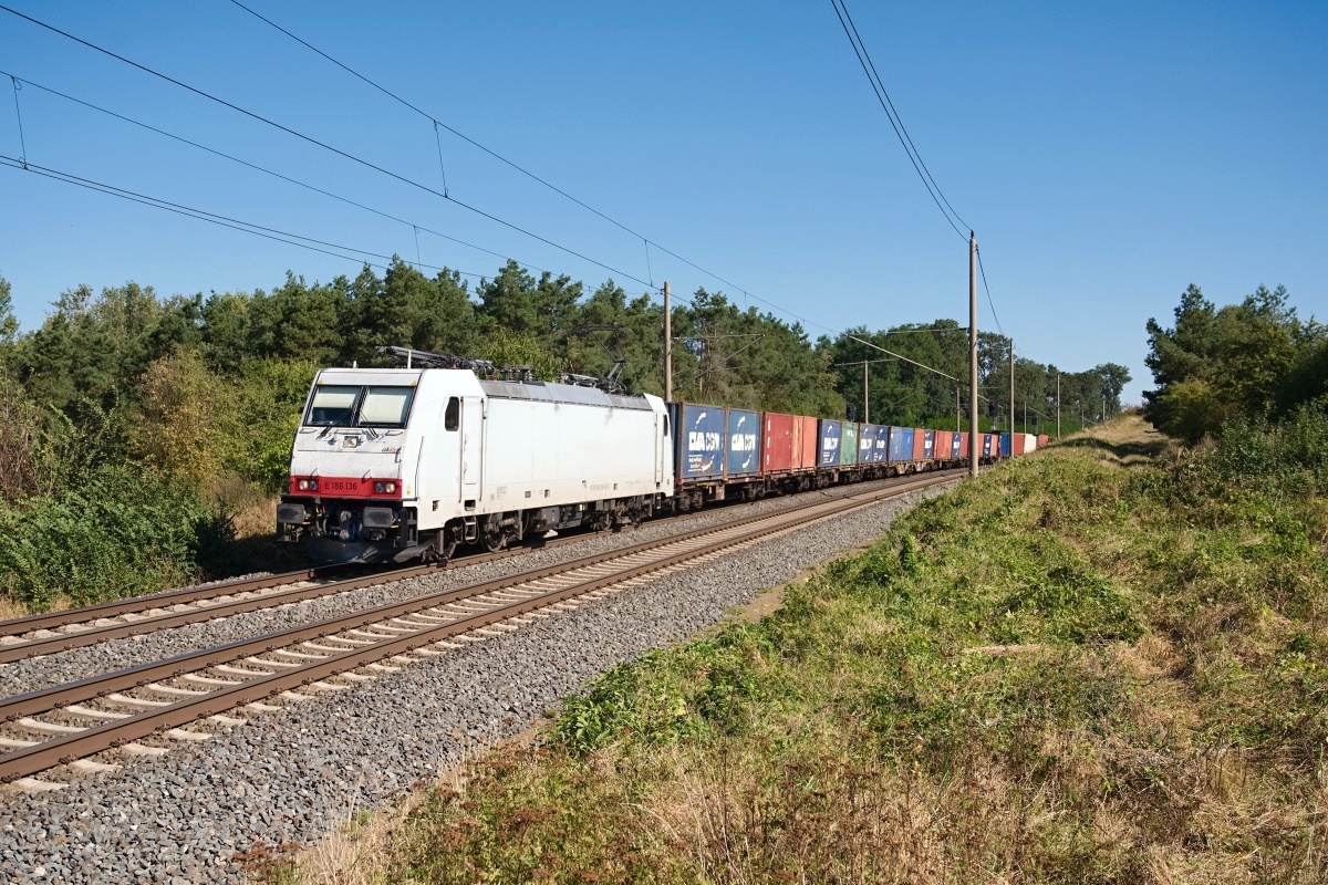 Dto. 186 136-8 am 11.10.2024 bei Dreileben-Drackenstedt mit einem