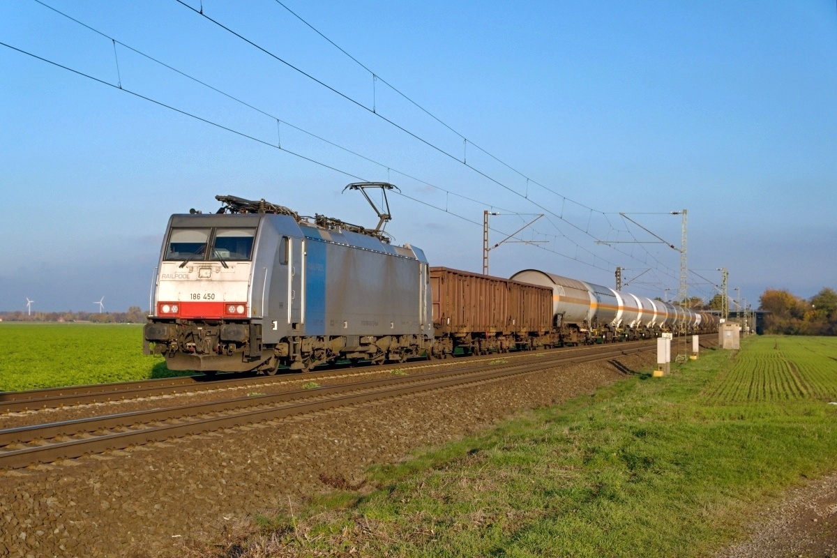 Dto. 186 448-7 am 01.02.2025 im Bf Oelde mit einem Kesselwagenzug Rtg.