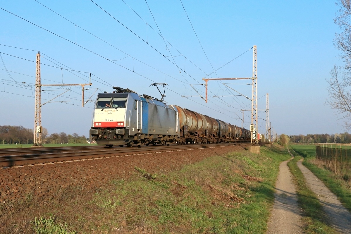 Dto. 186 503-9 am 27.01.2024 bei Kirchhorsten (HKHN) mit Kesselwagen Rtg.