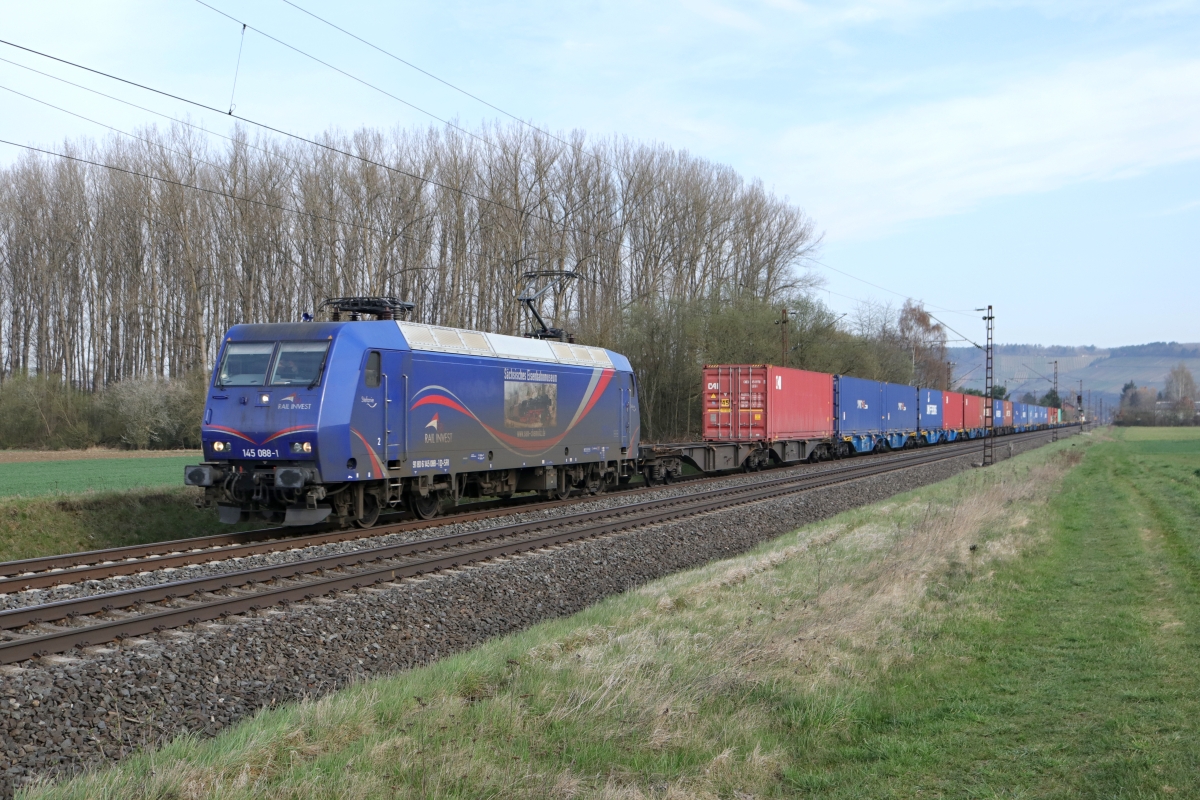 145 088-1 passierte hier am 10.04.2018 Rezbach-Zellingen mit einem CT-Zug