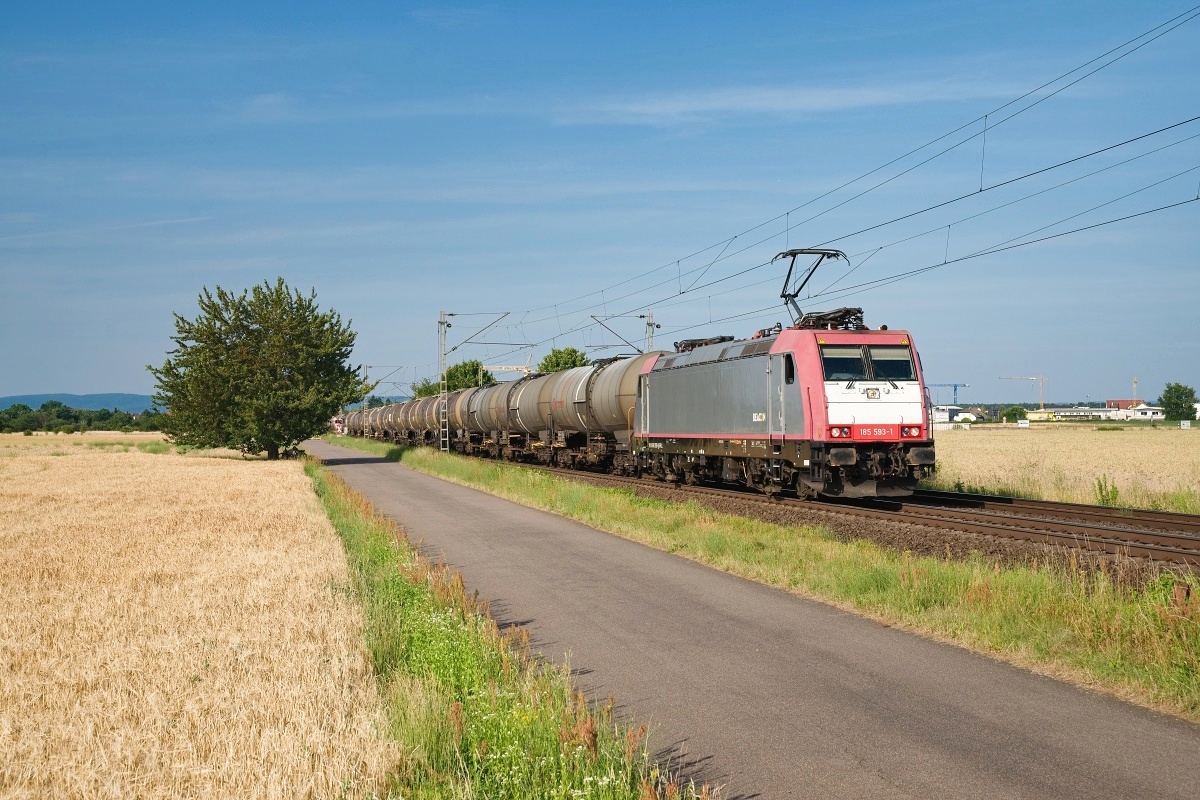 Dto. 185 593-1 am 22.06.2025 bei Babenhausen (FBA) mit Kesselwagen
