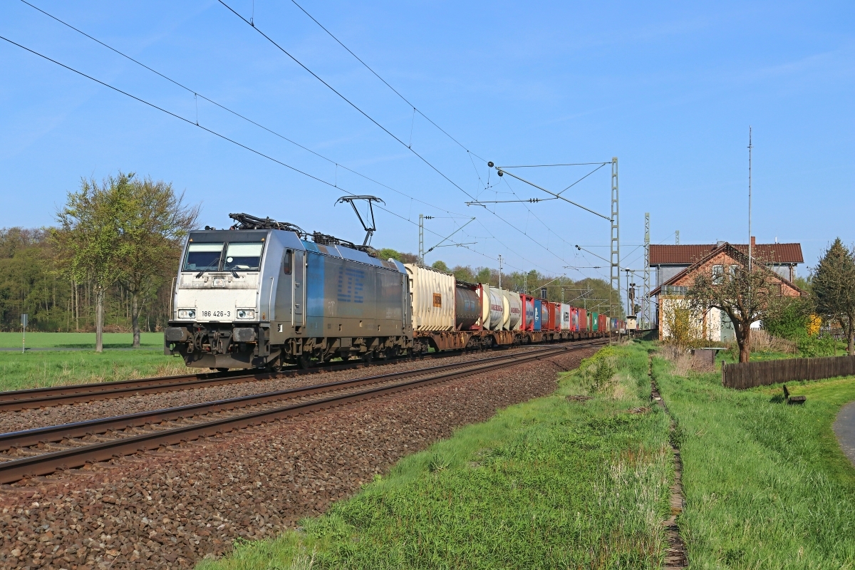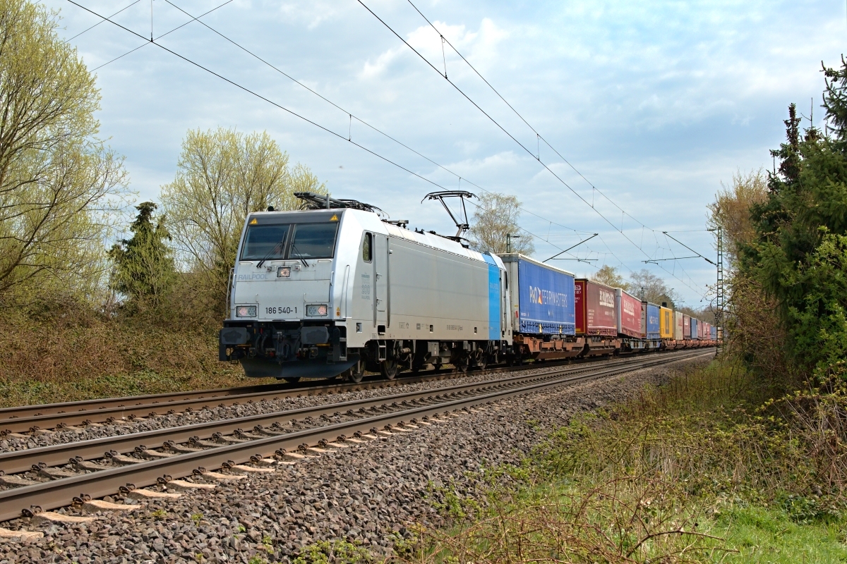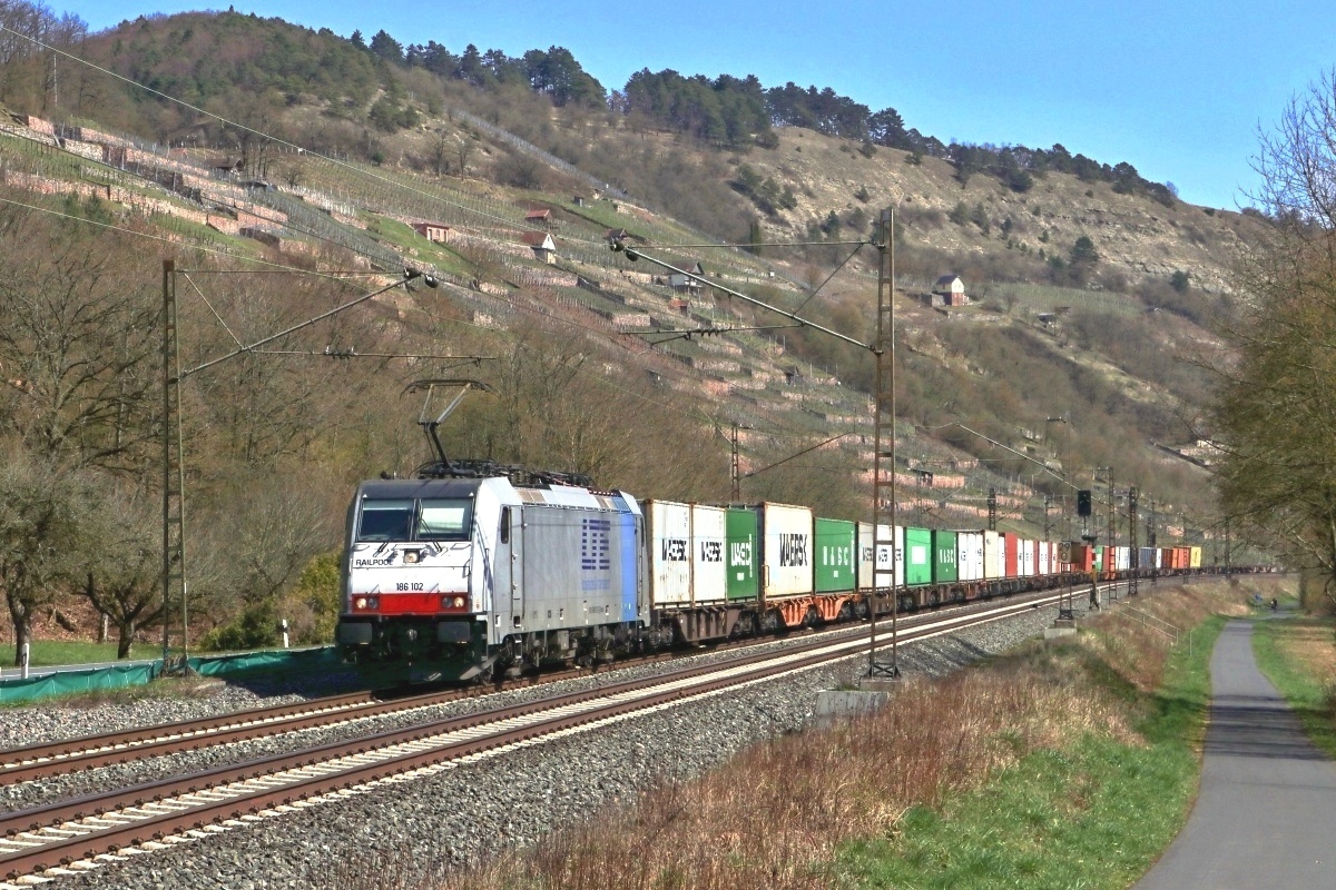 Dto. 186 102-0 am 10.04.2018. Hier war die Lok bei Retzbach-Zellingen auch mit einem CT-Zug, aber in