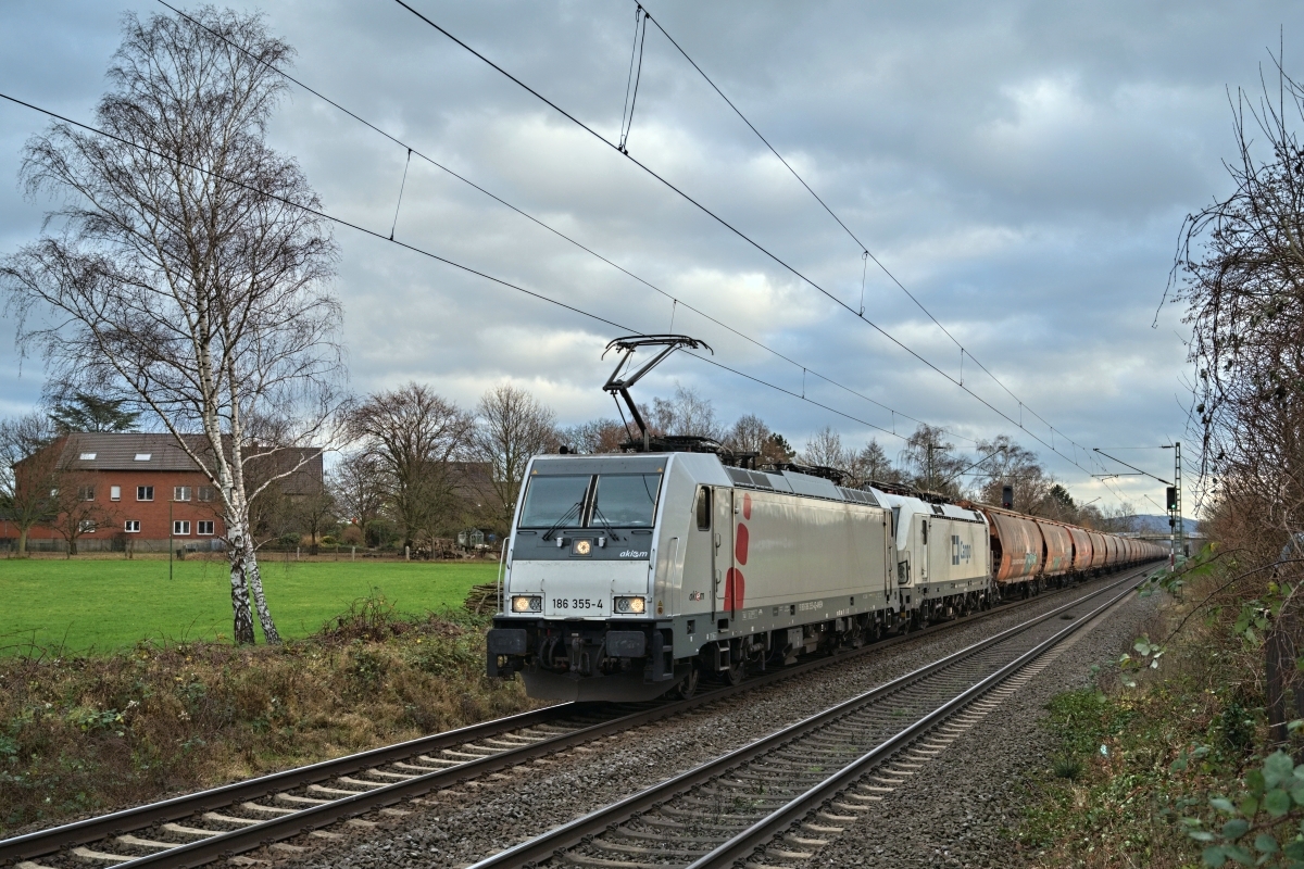 Dto. 186 355-4 am 10.12.2021 bei Bückeburg (HBKB) Evesen mit Wagenlok CD CARGO 193