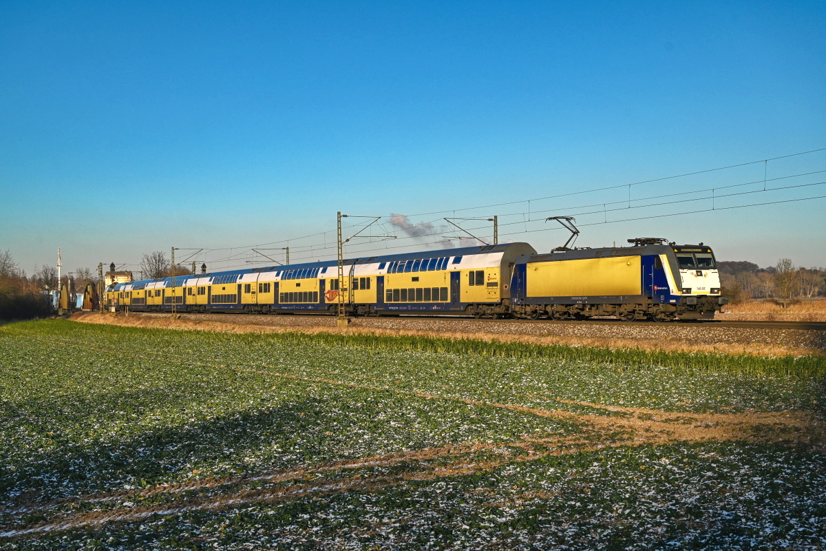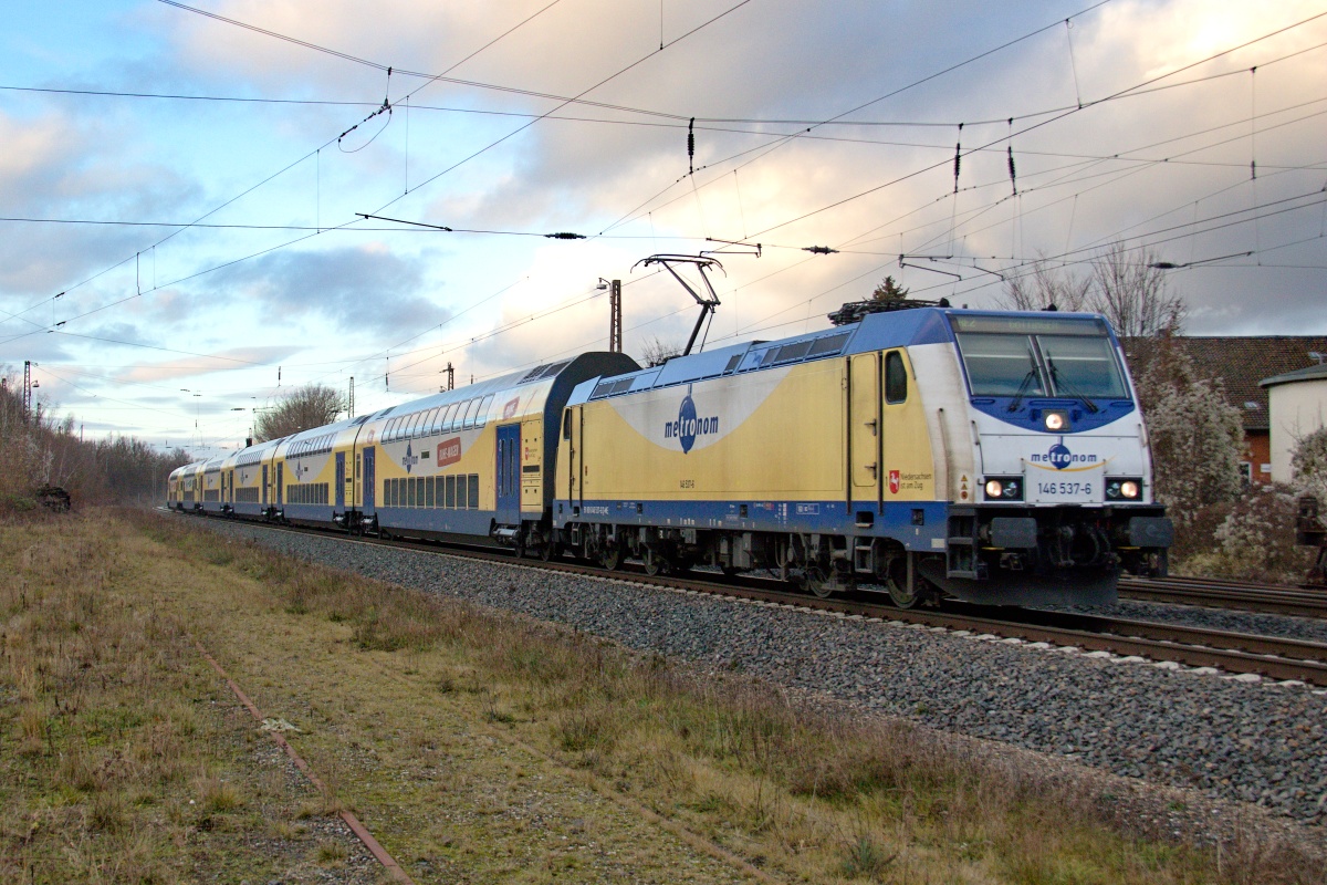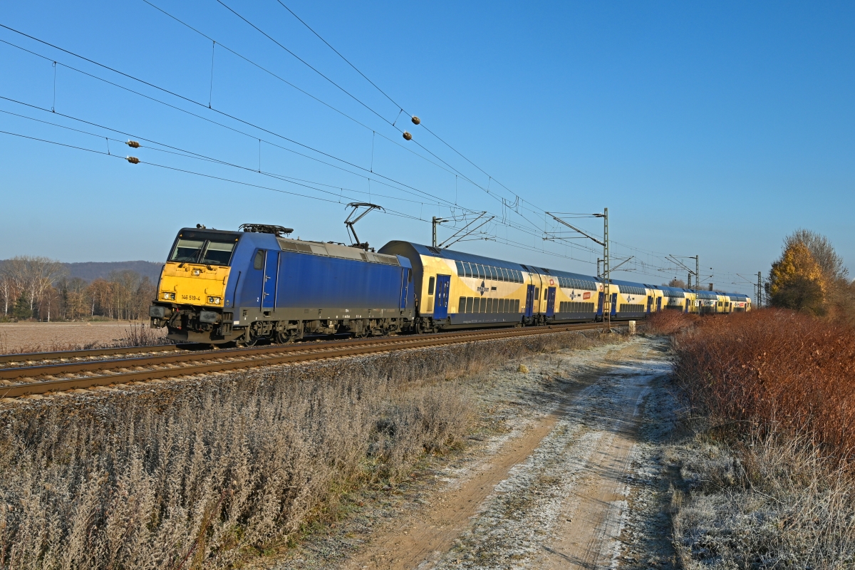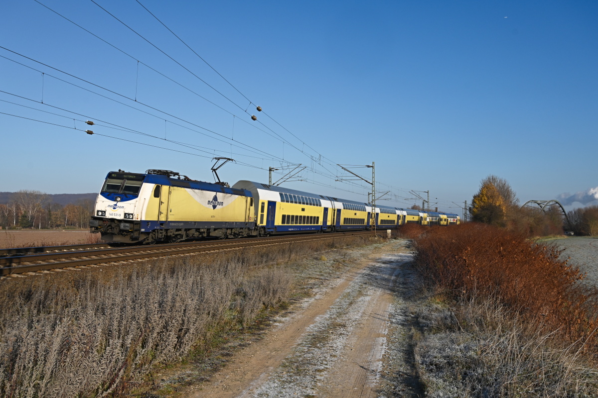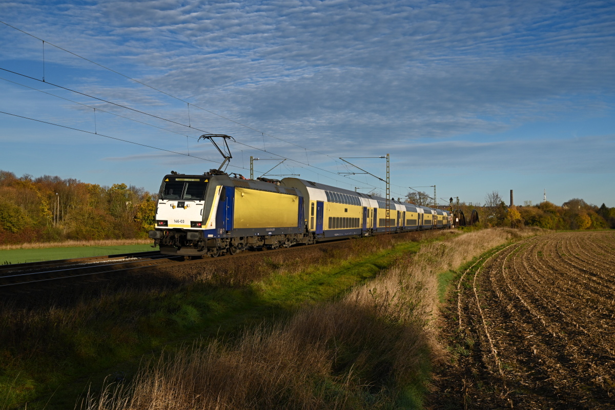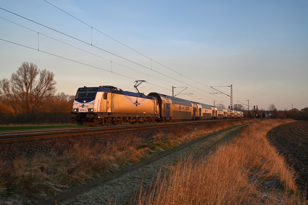 Dto. 146 509-5 am 12.011.2022 im Morgenlicht bei Elze (HELZ) mit dem RE2 nach Göttingen Hbf...