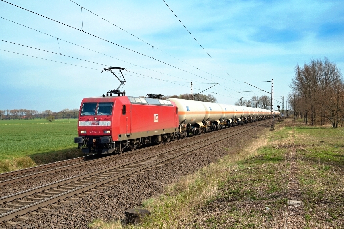 Dto. 145 050-1 am 25.03.2022 bei Bückeburg (HBKB) mit einem Kesselwagenzug