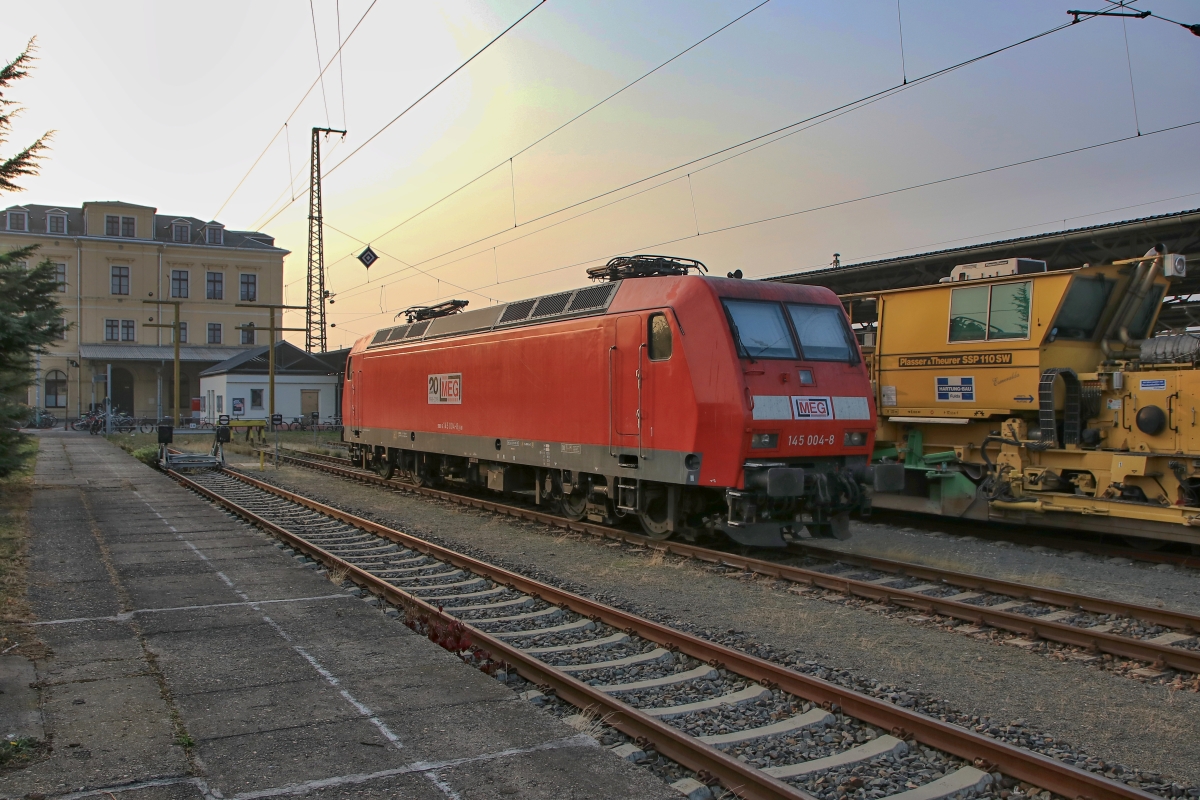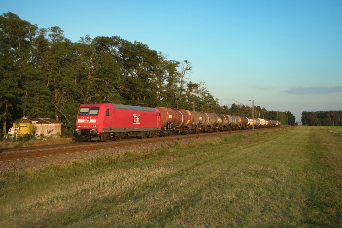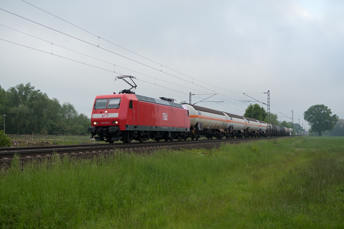 Dto. 145 061-8 im aktuellen MEG Design früh morgens am 14.05.2024 bei