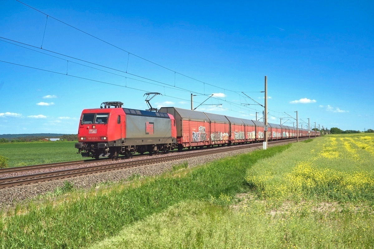 Dto. 145 025-3 am 14.05.2024 im aktuellen MEG Design bei Ovelgünne (LOV) mit