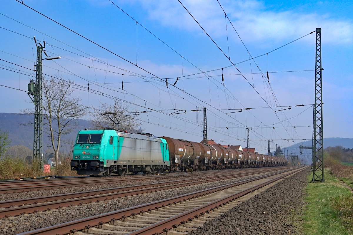 185 617-8 (NVR: 91 80 6185 617-8 D-ATLU) getauft auf "Zoe" passierte hier am 11.04.2018 Vennebeck (HVBK) mit einem Kesselwagenzug Rtg. Westen/Löhne...