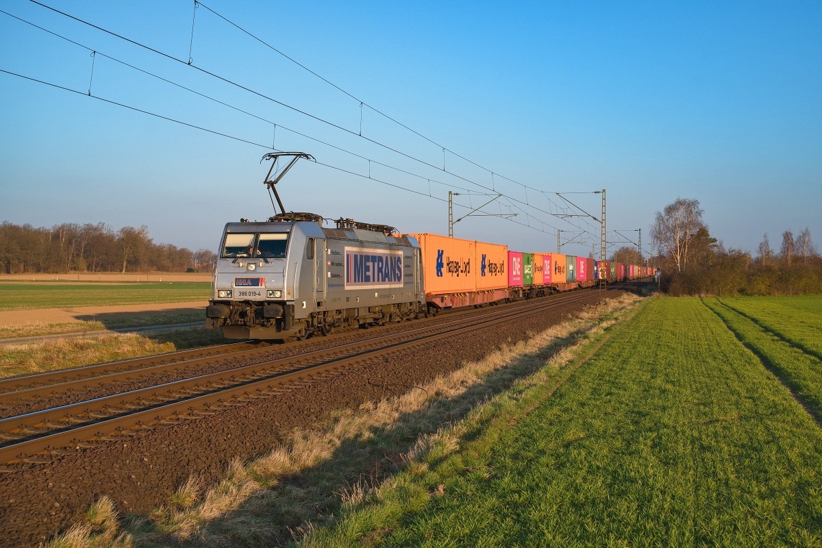 Dto. 386 011-1 spät nachmittags am 21.03.2025 bei Vechelde (HVE) Sierße mit