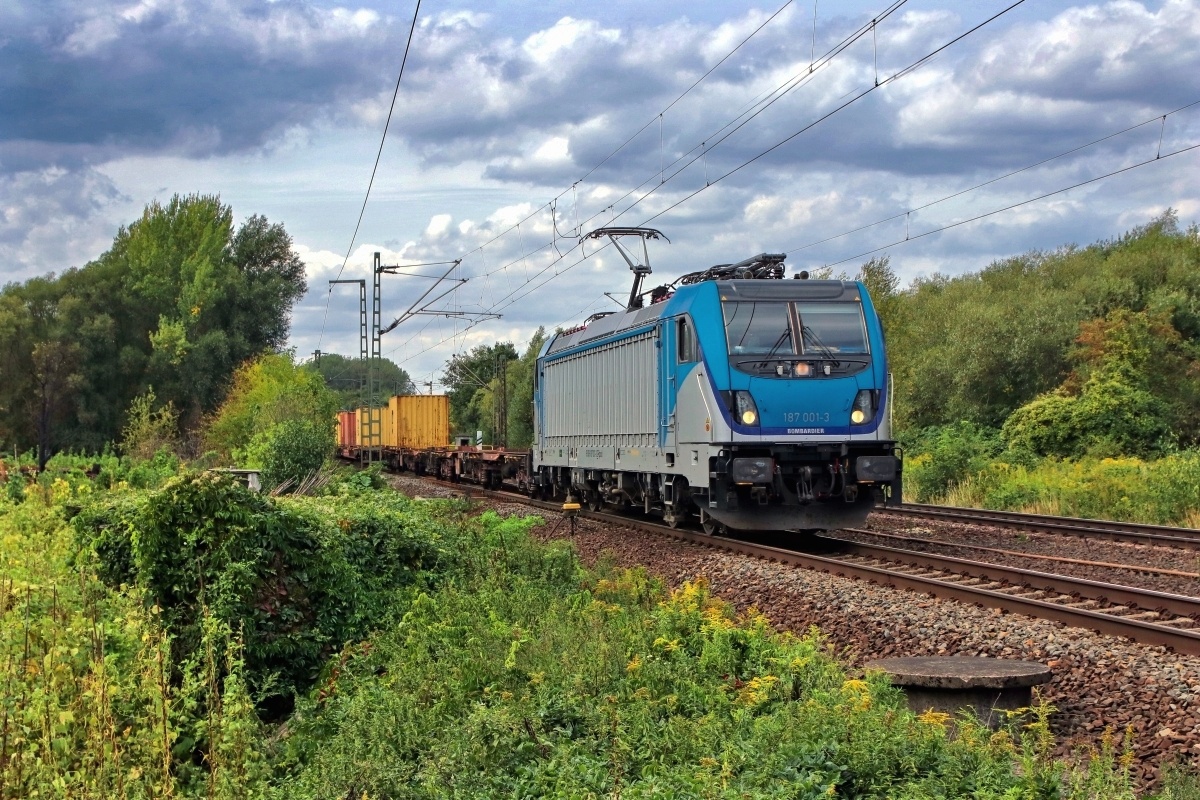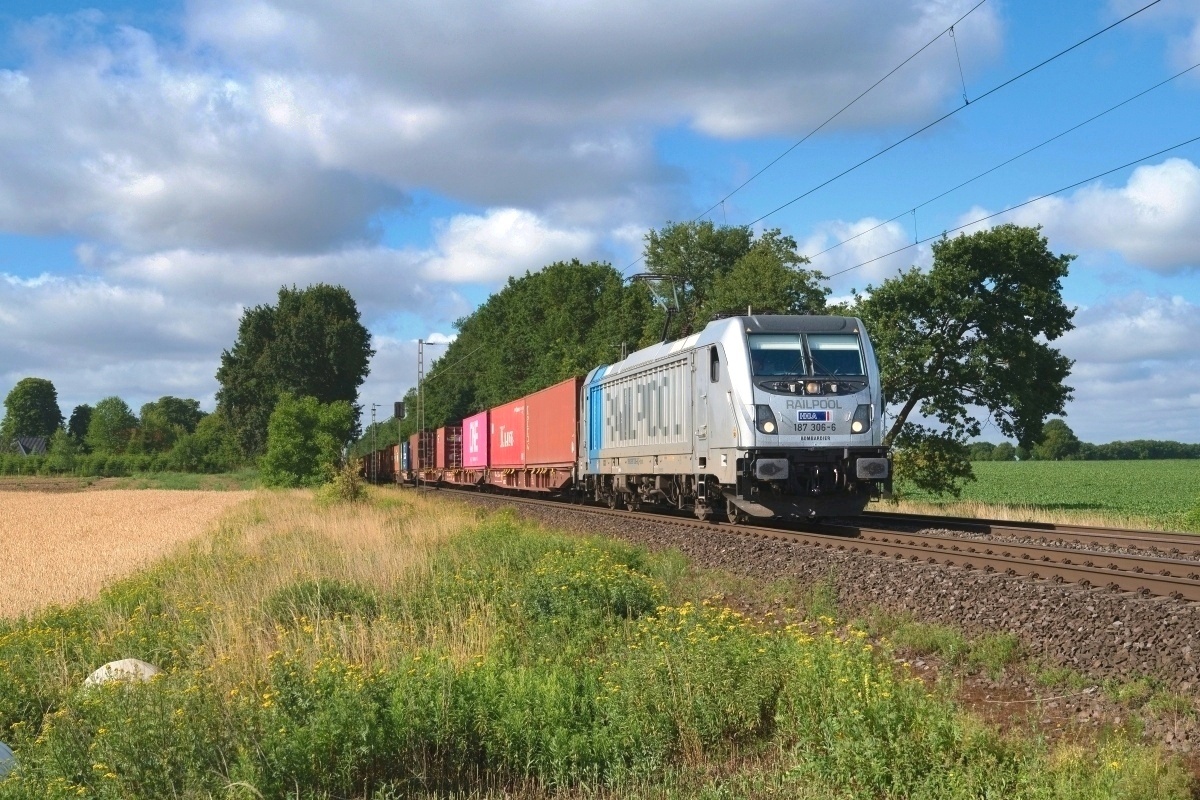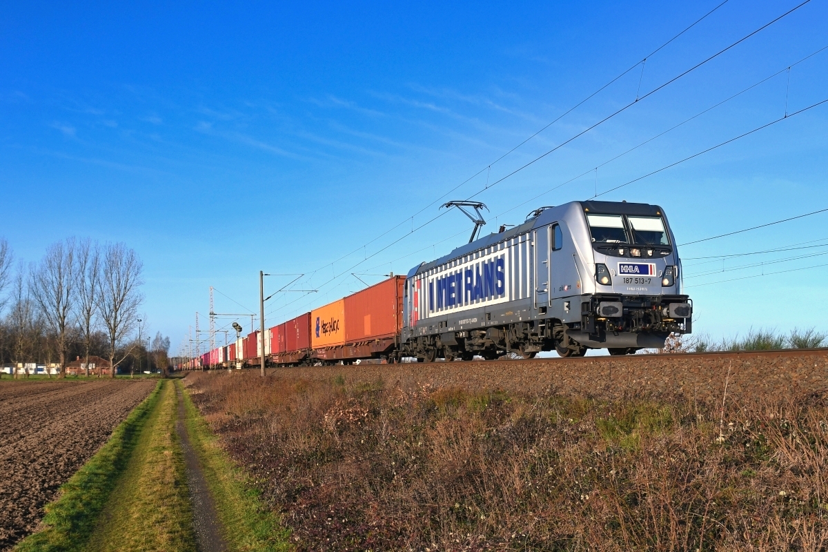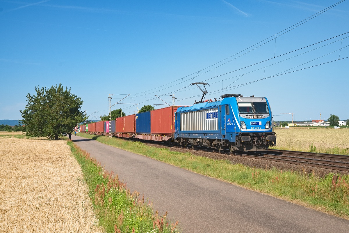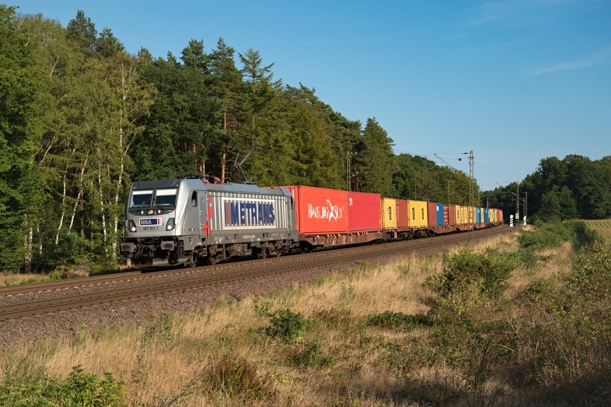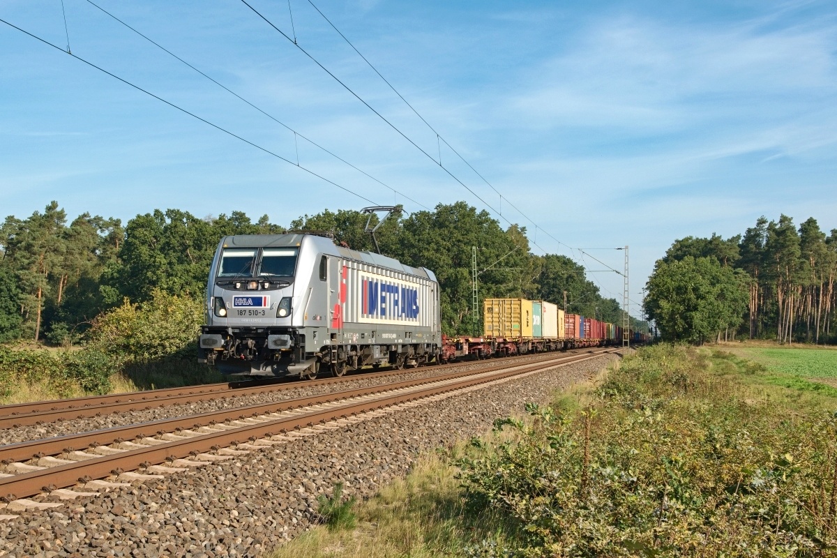 Dto. 187 511-1 am 23.08.2022 bei Linsburg (HLBU) mit einem Containerzug Rtg.