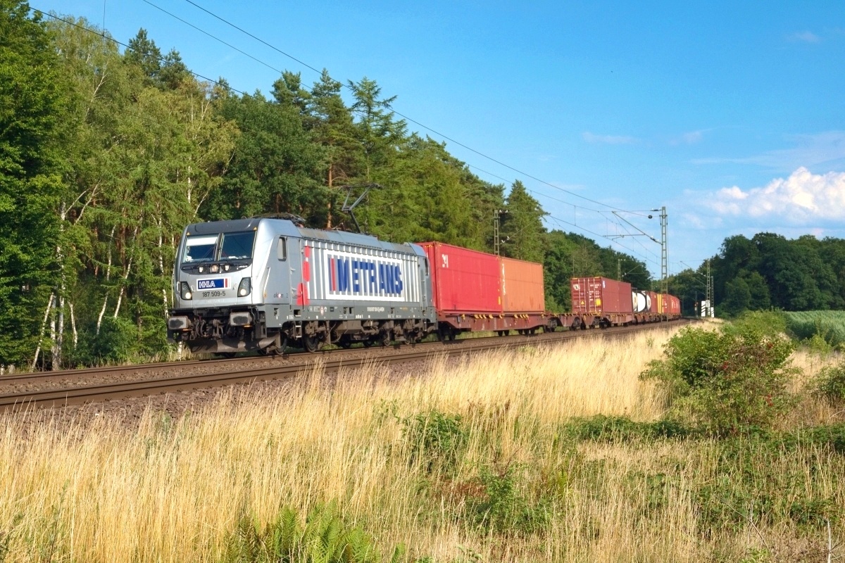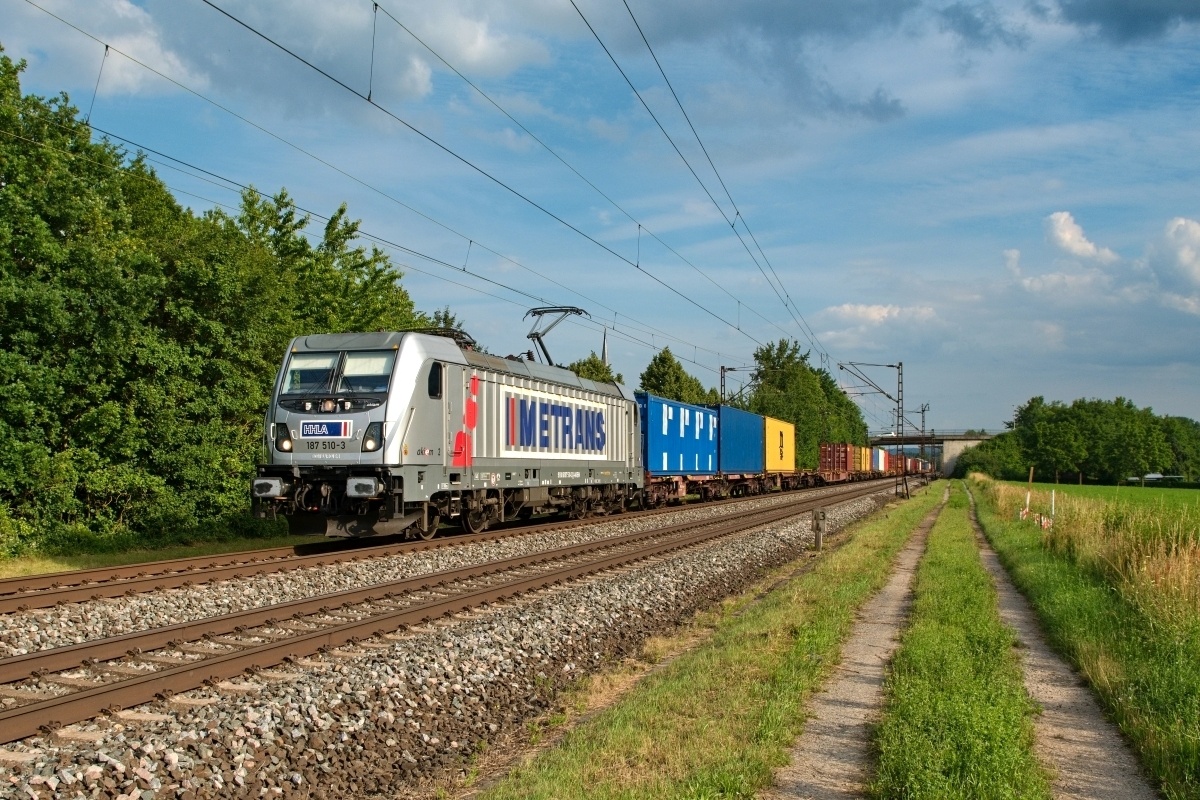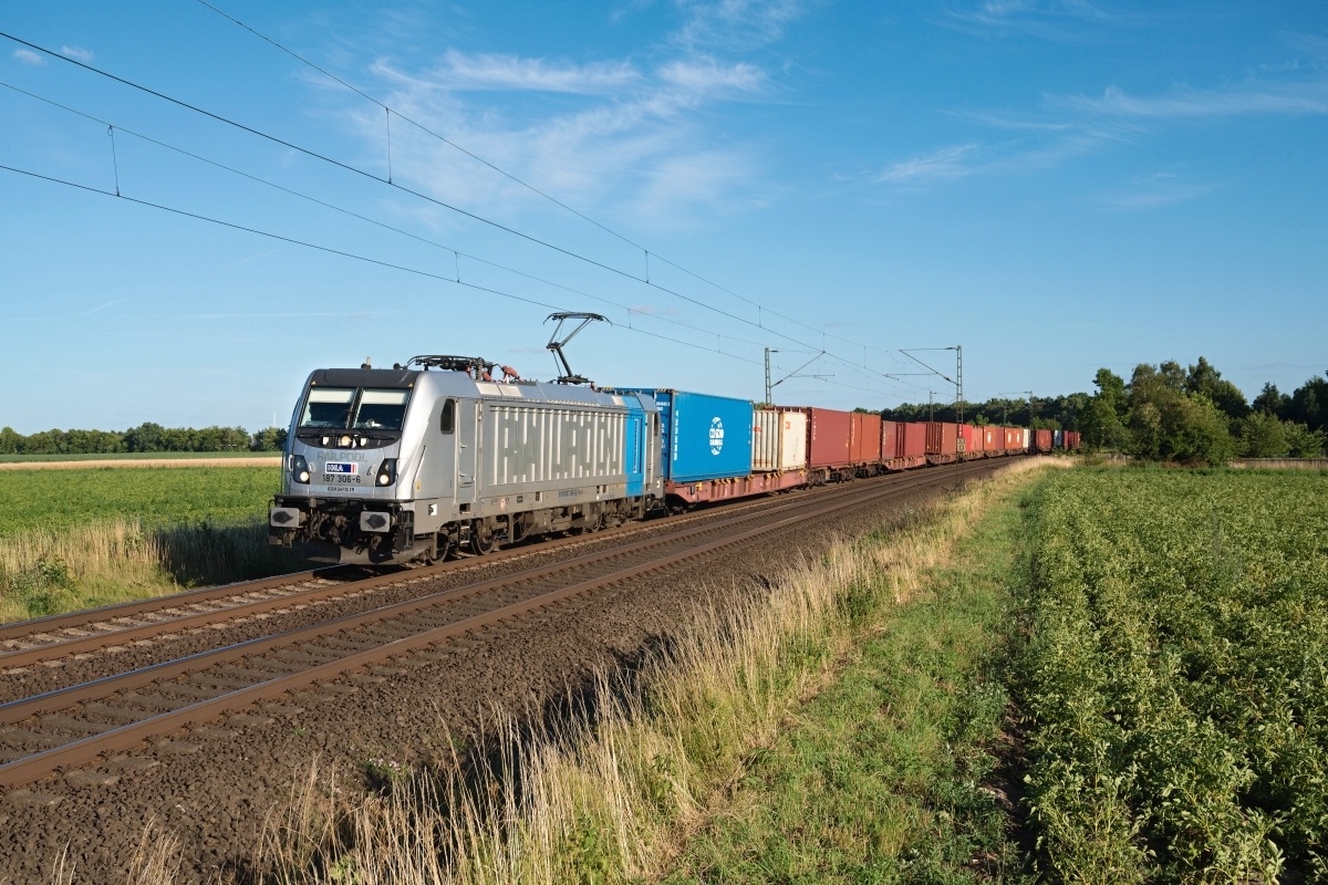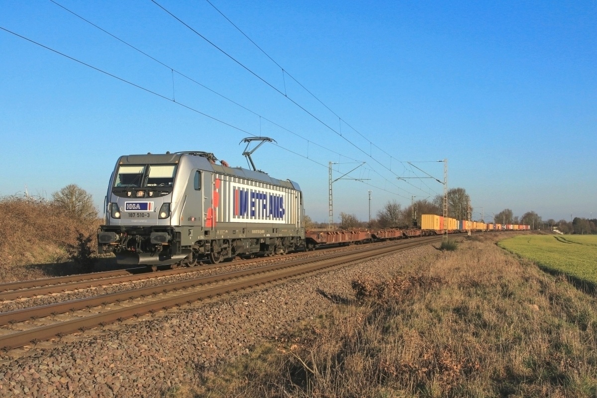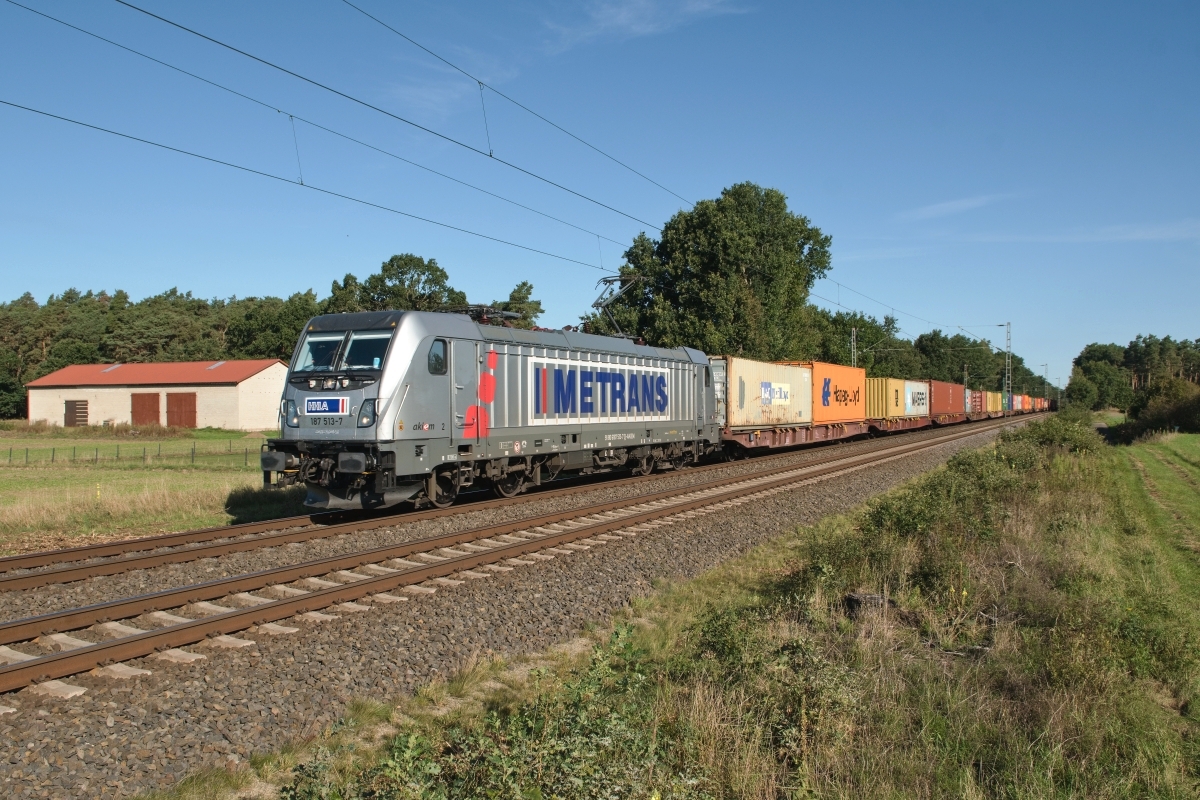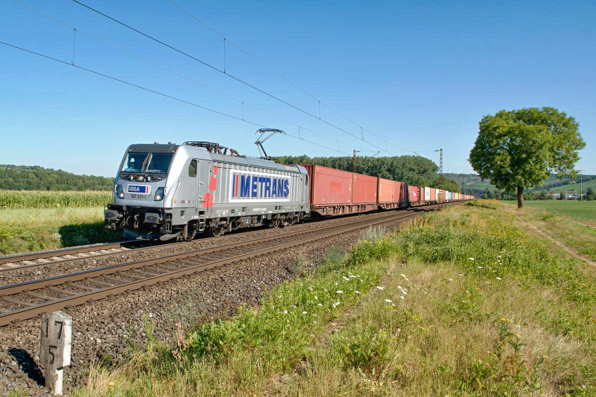 Dto. 187 511-1 am 23.08.2022 bei Linsburg (HLBU) mit einem Containerzug Rtg.