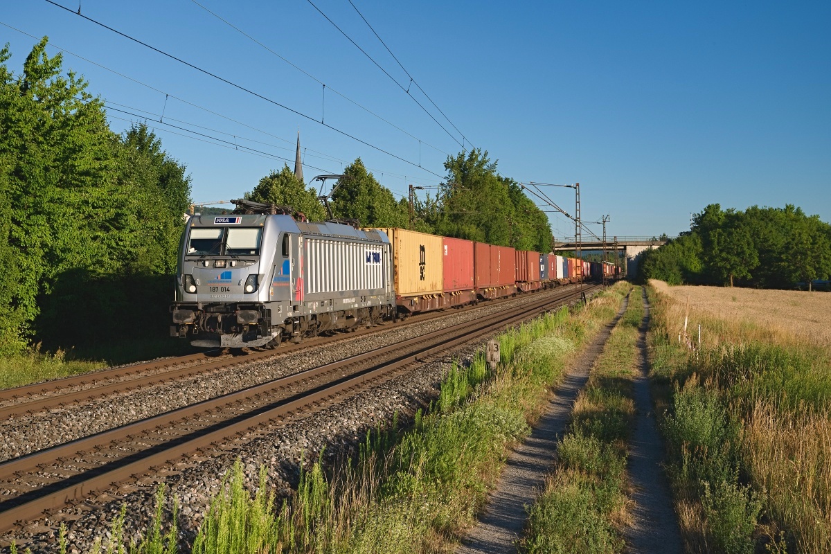 Dto. 187 014-6 am 19.07.2024 bei Klein-Gerau mit einem teilbeladenen CT-Zug