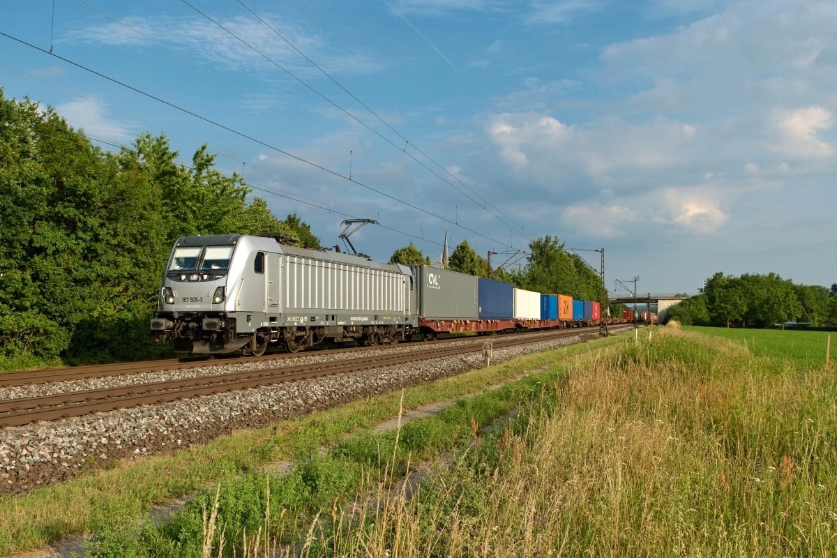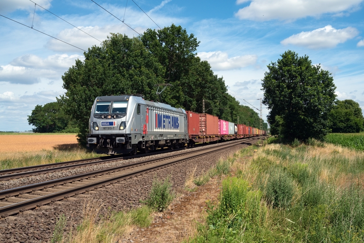 Dto. 187 509-5 am 13.07.2022 bei Linsburg (HLBU) mit einem Containerzug Rtg.
