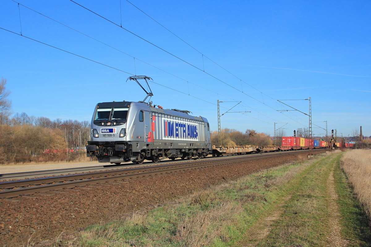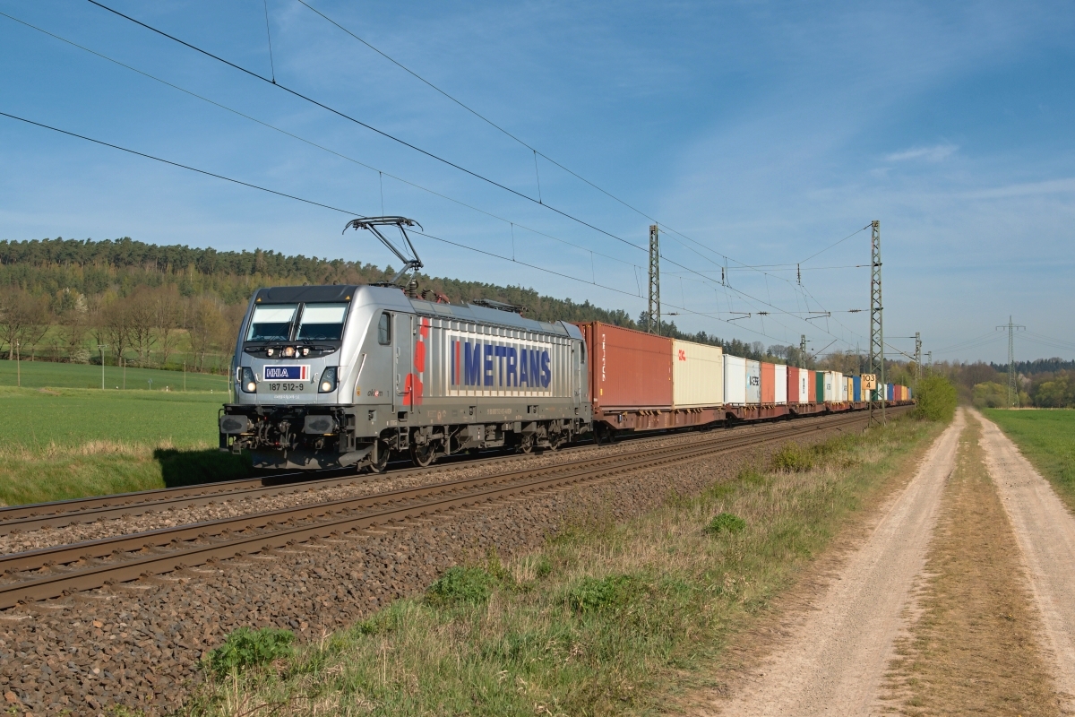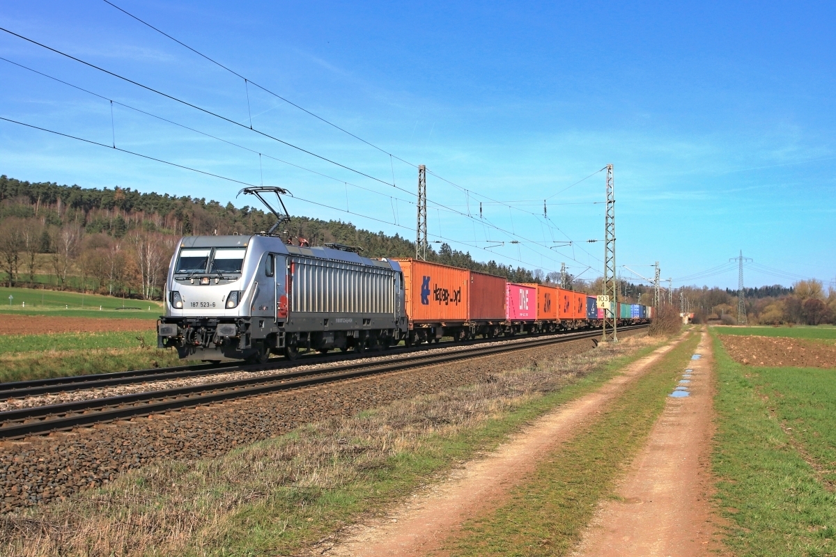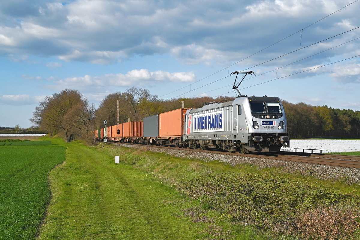 to. 187 509-5 am 05.04.2023 im Gümmer Wald(HGUE) mit einem Containerzug Rtg.