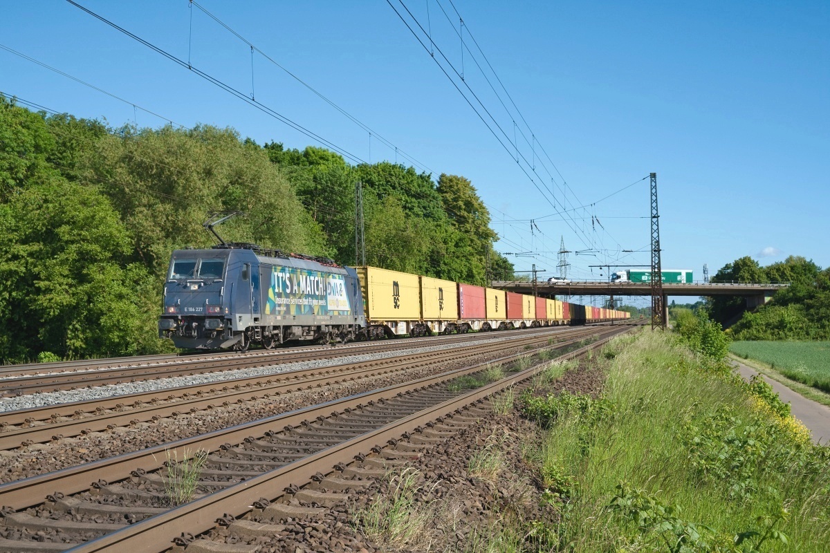 war hier am 16.05.2025 bei Porta-Westfalica (HPTH) mit dem Containerzug DGS