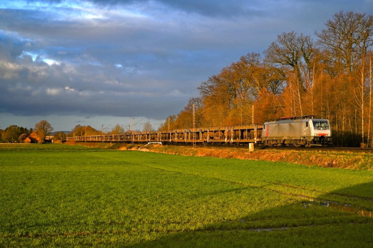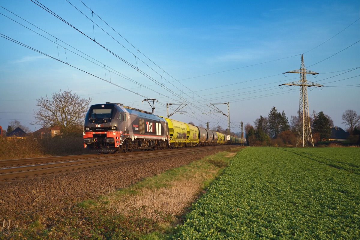 hier am 10.03.2025 im Abendlicht bei Bückeburg (HBKB) mit dem Getreidewagen