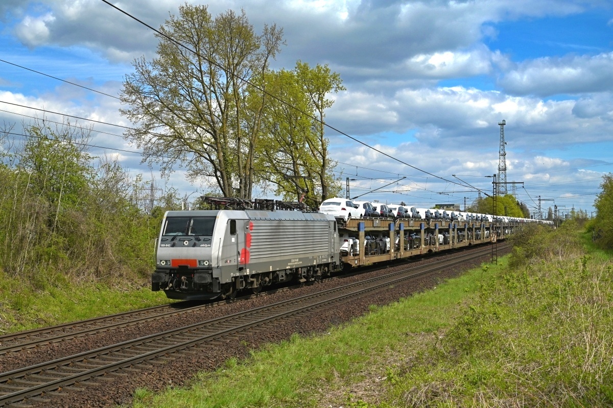 Dto. 189 842-8 am 27.04.2023 bei Ahlten (HALT) mit einem Voll-BLG Autozug