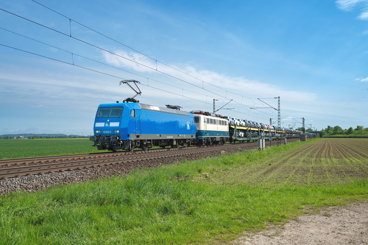 Dto. 145 023-6 am 03.05.2025 bei Lindhorst (HLH) "Voll aus dem Gegenlicht"