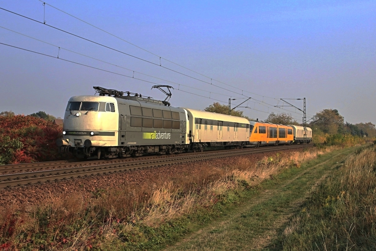 103 222-6 passierte hier am 18.10.2018 Zeithain Bogendreieck (DZN) mit dem CZ "Siemens Desiro" (NVR: 95 80 0642 336-1 D-RJSK) zwischen den beiden