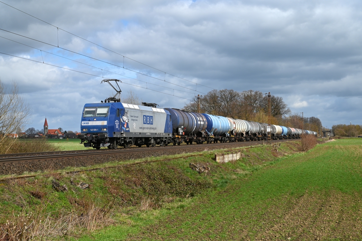 im Nachschuss am 25.03.2022 bei Bückeburg bei einer Tfzf mit der Zuglok 145