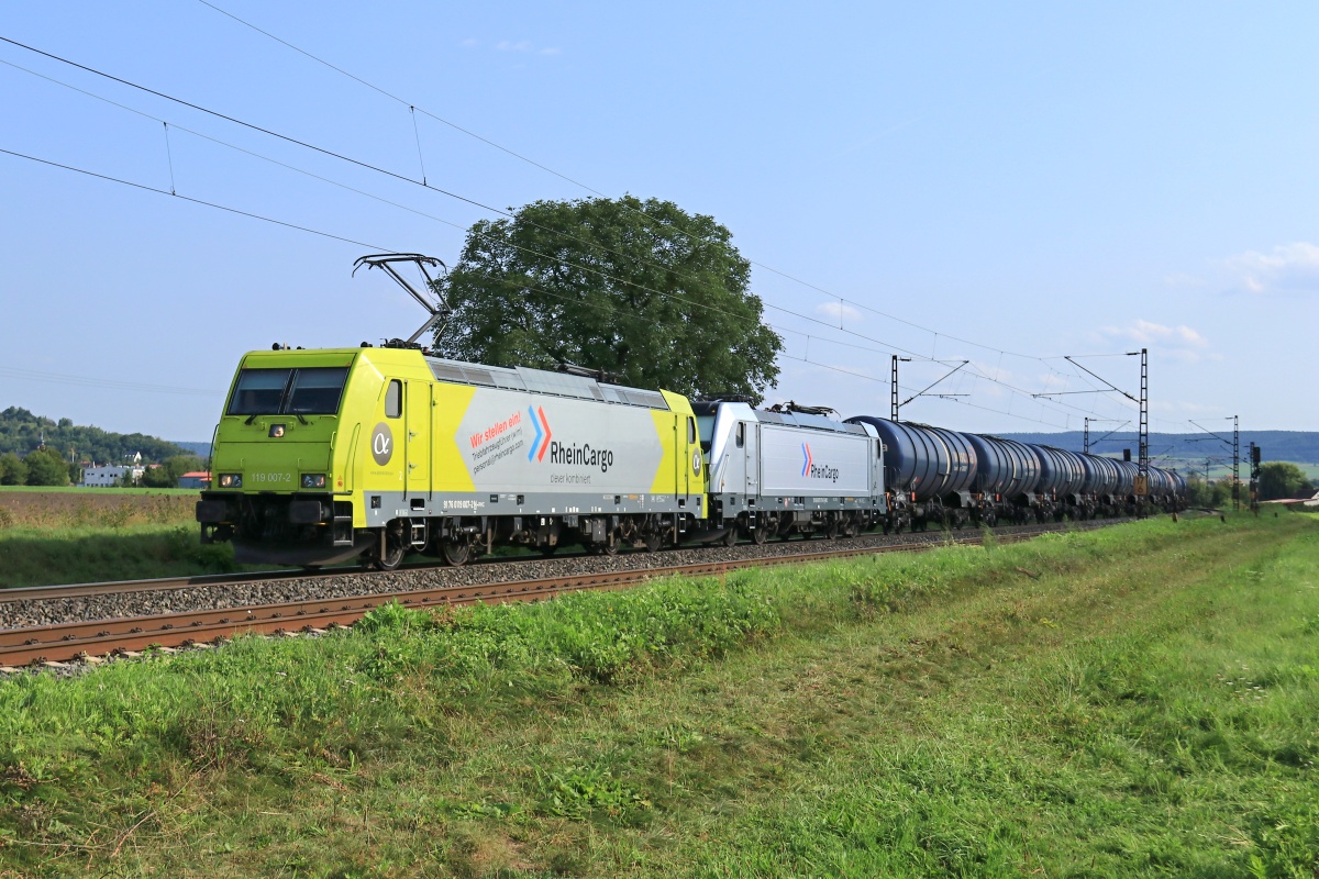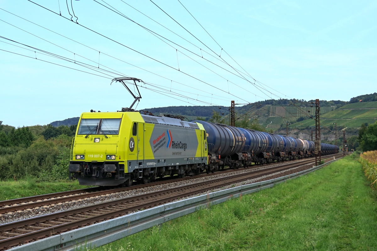 119 007-2 passierte hier am 25.08.2017 Himmelstadt mit einem Kesselwagenzug