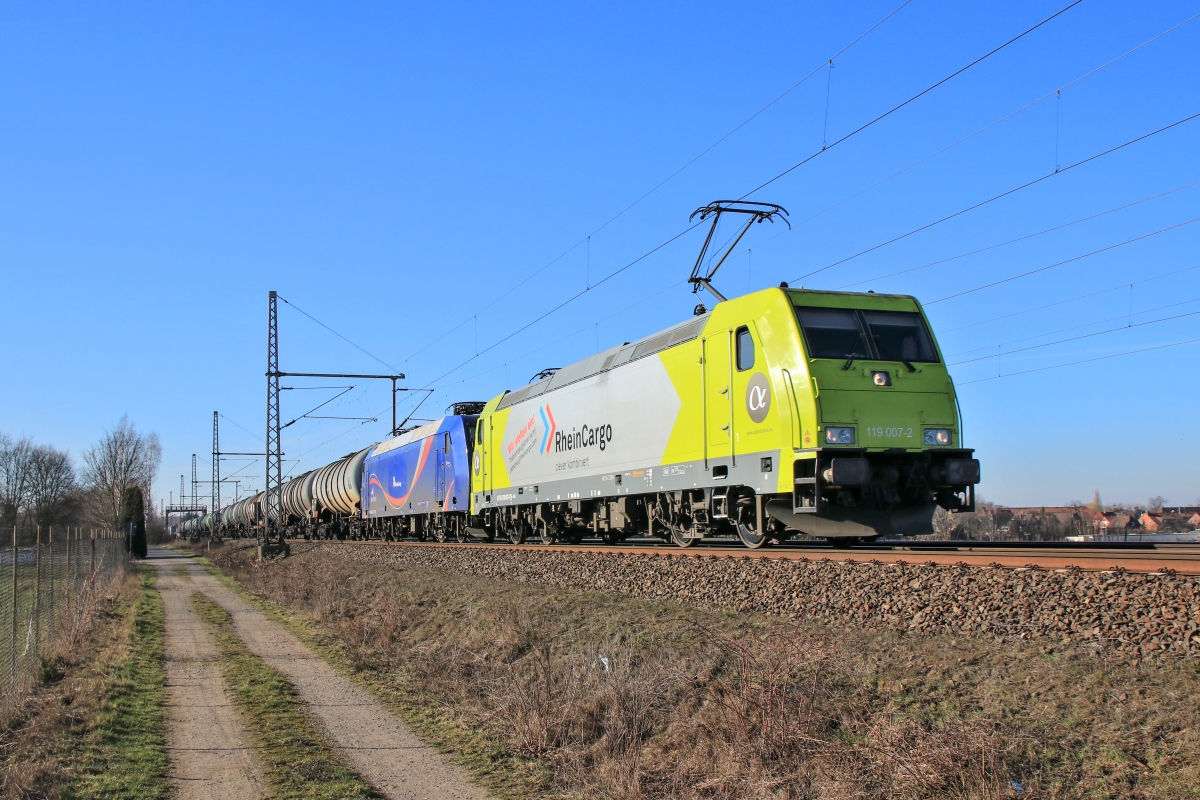 Hier war 119 007-2 am 25.08.2017 mit Wagenlok 187 074-0 und einem