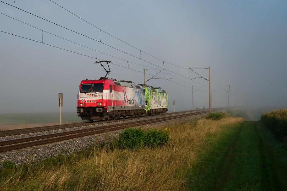 185 350-5 und Wagenlok 192 033-9 in Rtg. Süden/Ansbach (NAN) fahrend auf...