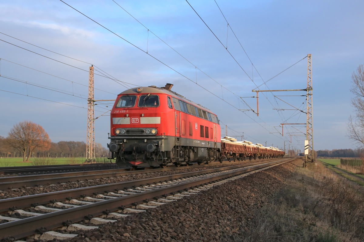 Dto. 218 469-5 am 19.11.2022 im Abendlicht bei Lindhorst (HLH) Vornhagen