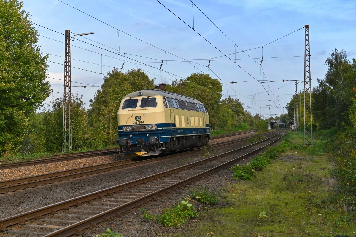 Dto. 218 466-1 am 11.10.2023 im Nachschuss im Bückeburger Bf (HBKB) als
