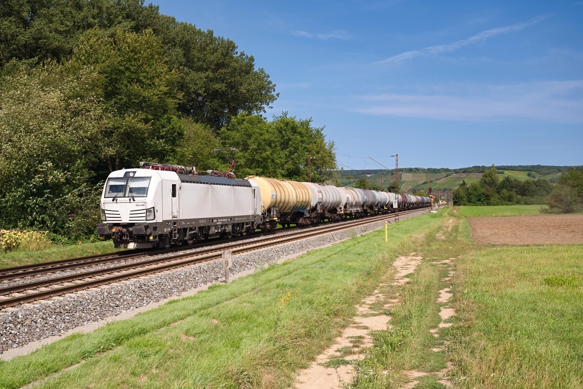 Dto. 193 485-0 am 11.08.2023 bei Himmelstadt (NHIS) mit dem Kesselwagenzug