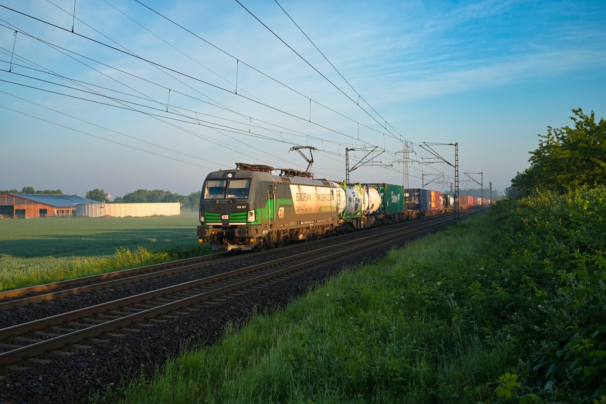 Dto. 193 727-5 im Morgendunst kurz nach Sonnenaufgang um 06:14 Uhr am