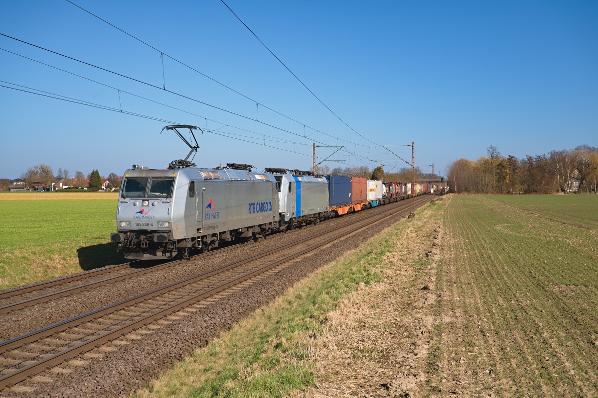 Dto. 185 539-4 am 11.04.2025 bei Bückeburg (HBKB) mit dem Hccrrs Ganzzug