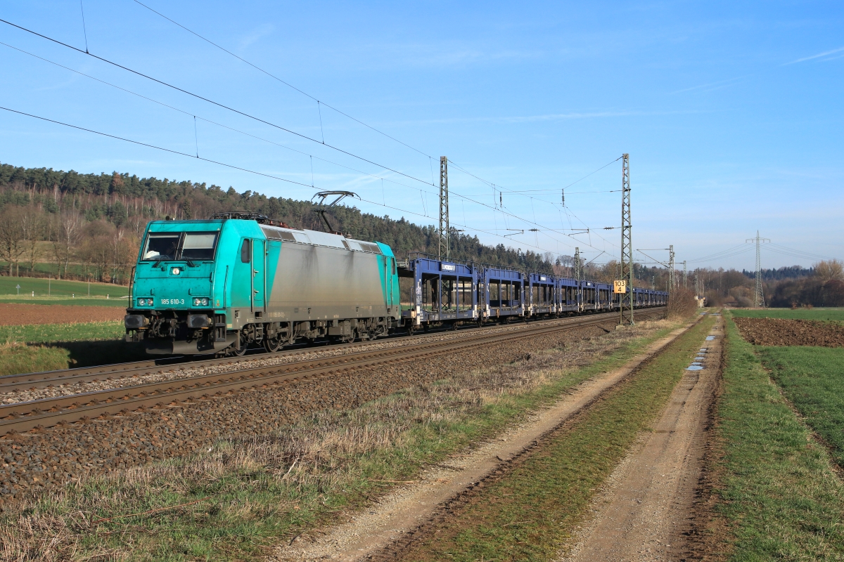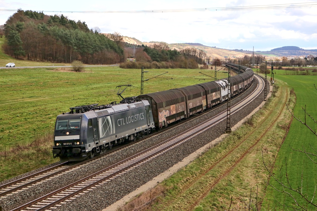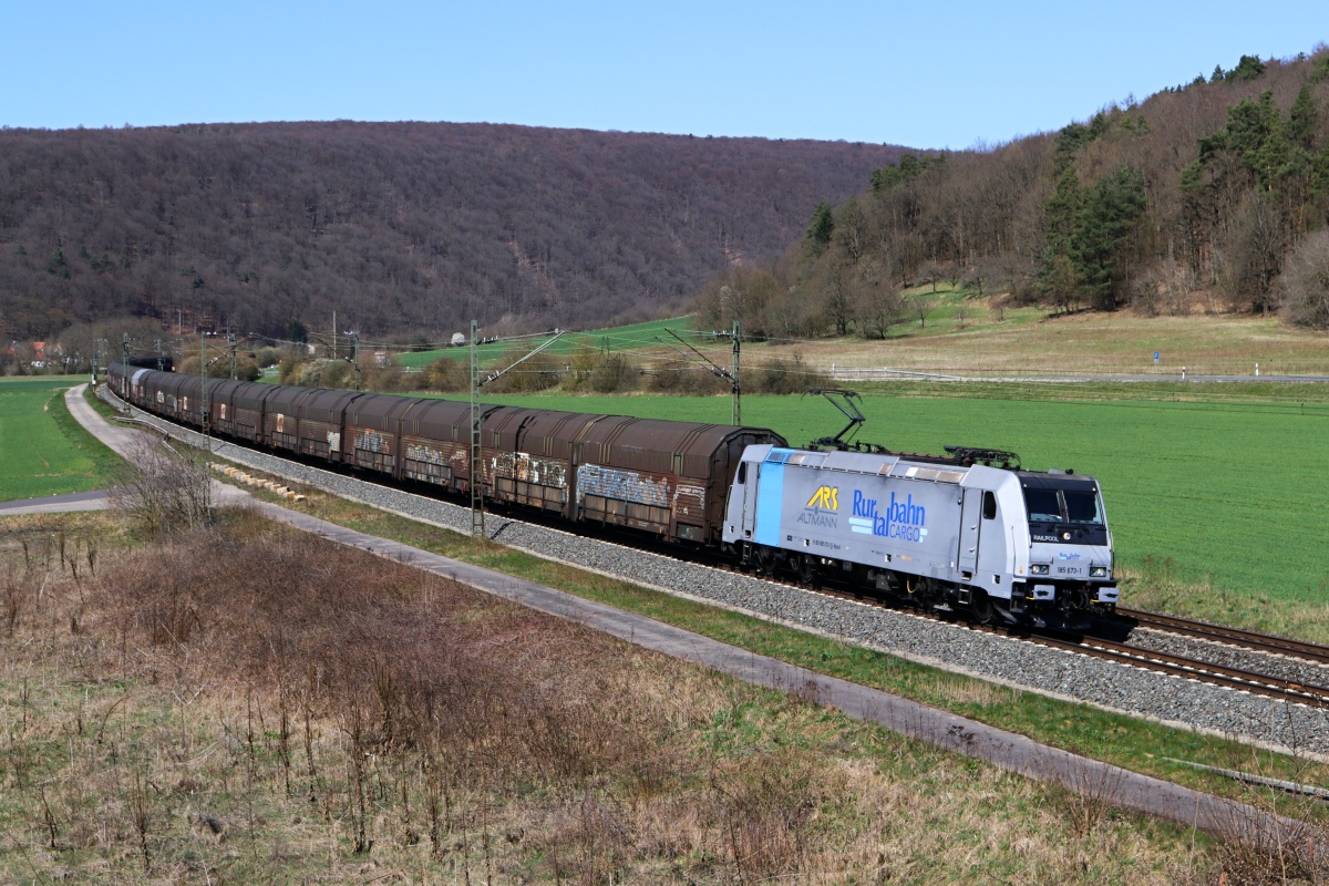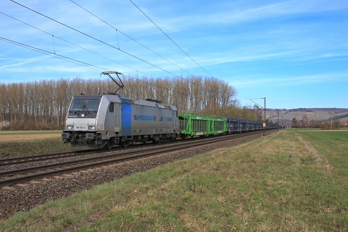 Dto. 185 672-3 am 22.03.2019 auch bei Retzbach-Zellingen. Hier war die Lok mit unbeladenen Hödlmayer/Touax