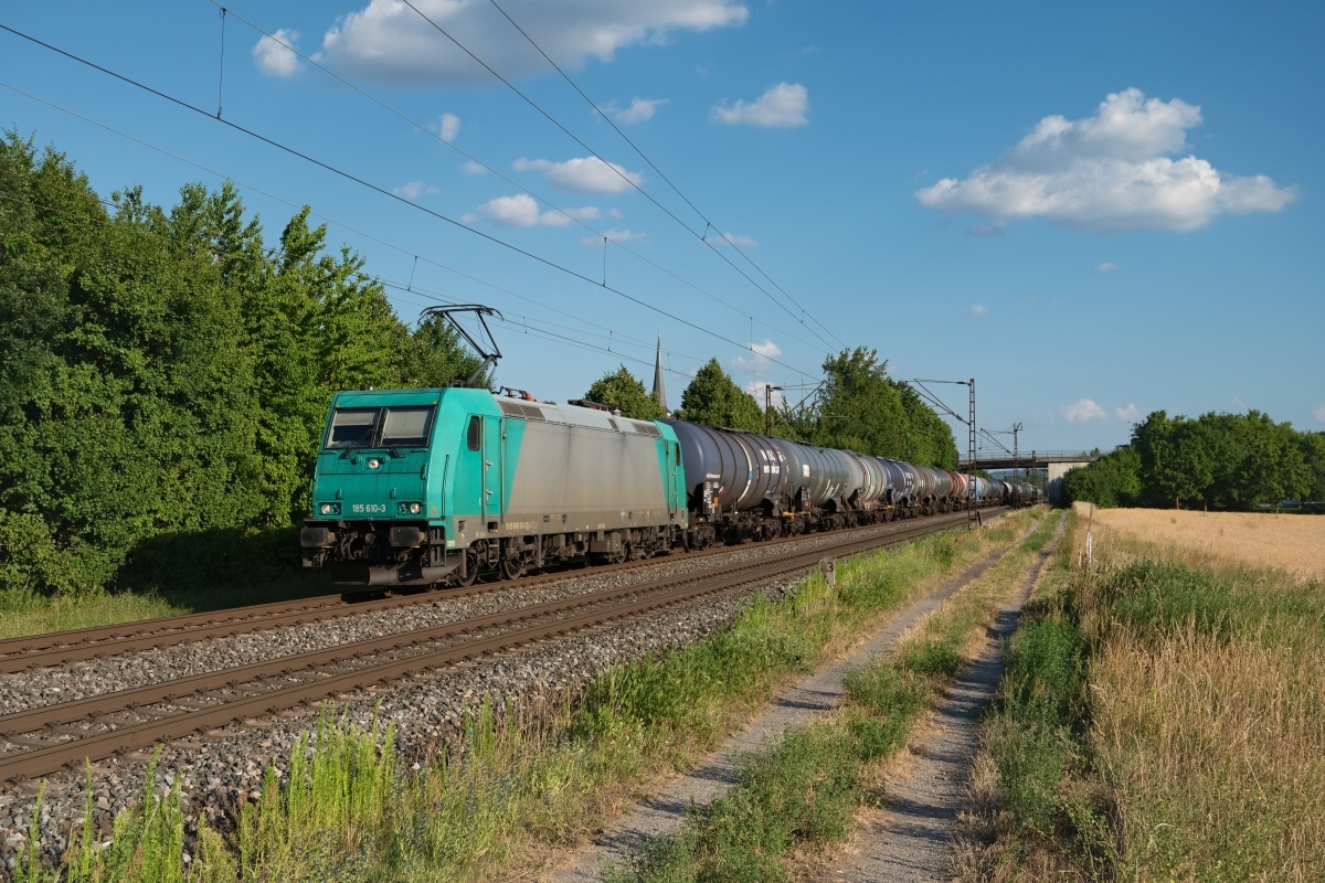 Dto. 185 610-3 am 23.06.2022 im Abendlicht bei Thüngersheim (NTHM) mit dem DGS 69628 von