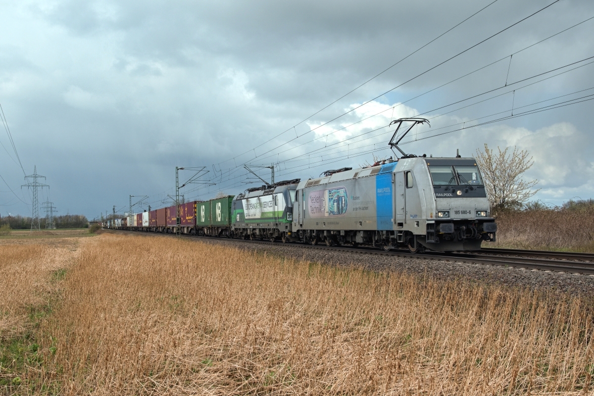 Dto. 185 680-6 am Mi 14.04.2021 bei Bückeburg (HBKB) Evesen mit Wagenlok 193
