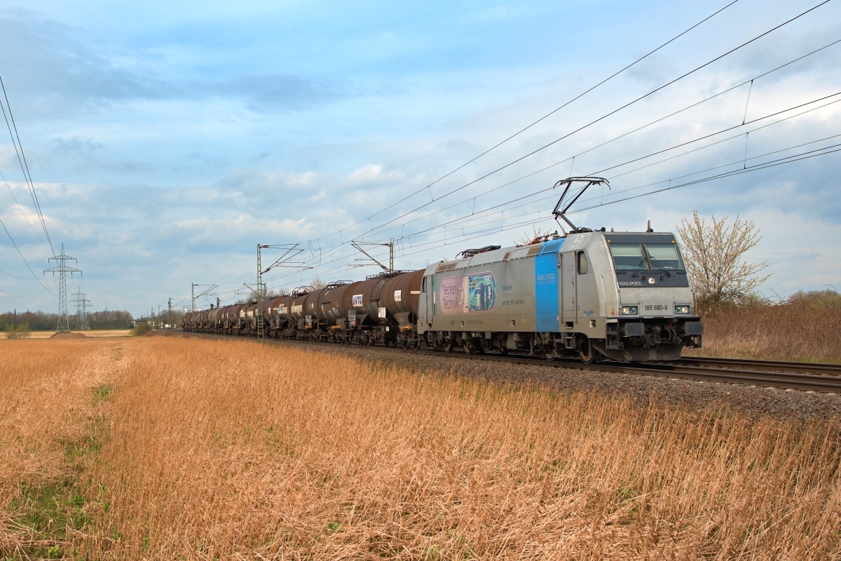 Dto. 185 680-6 am 09.04.2021 bei Bückeburg (HBKB) Evesen mit Kesselwagen