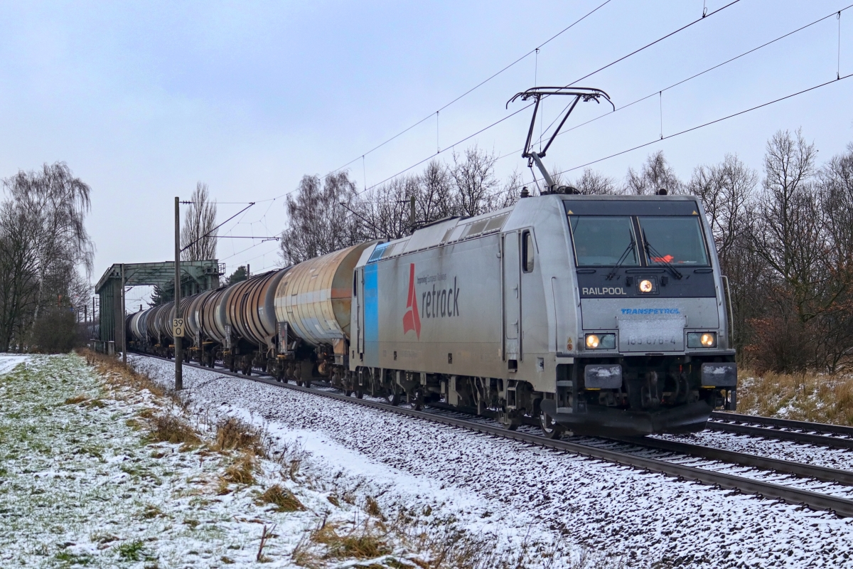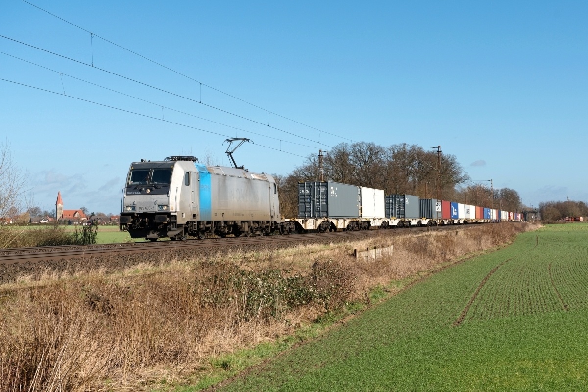 Dto. 185 696-2 ohne Novelis Werbung am 23.02.2023 bei Kirchhorsten (HKHN) mit dem CT-Zug