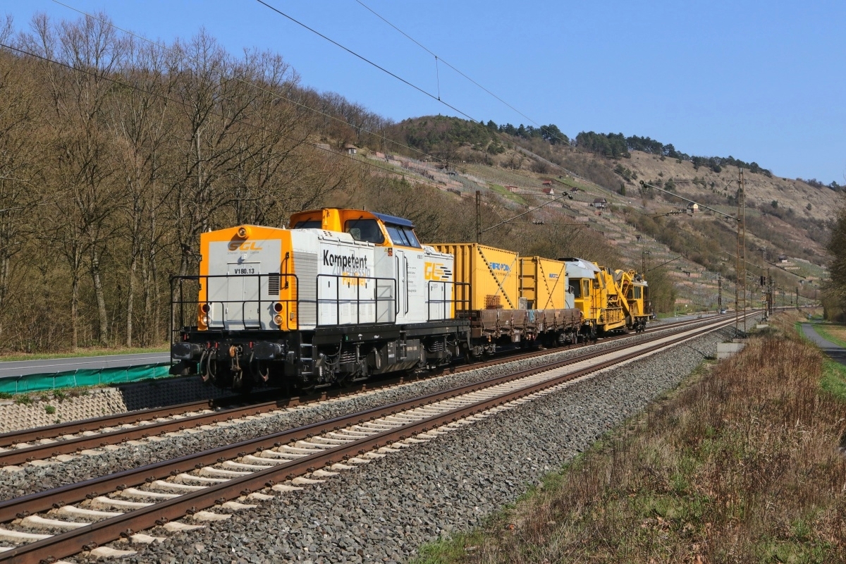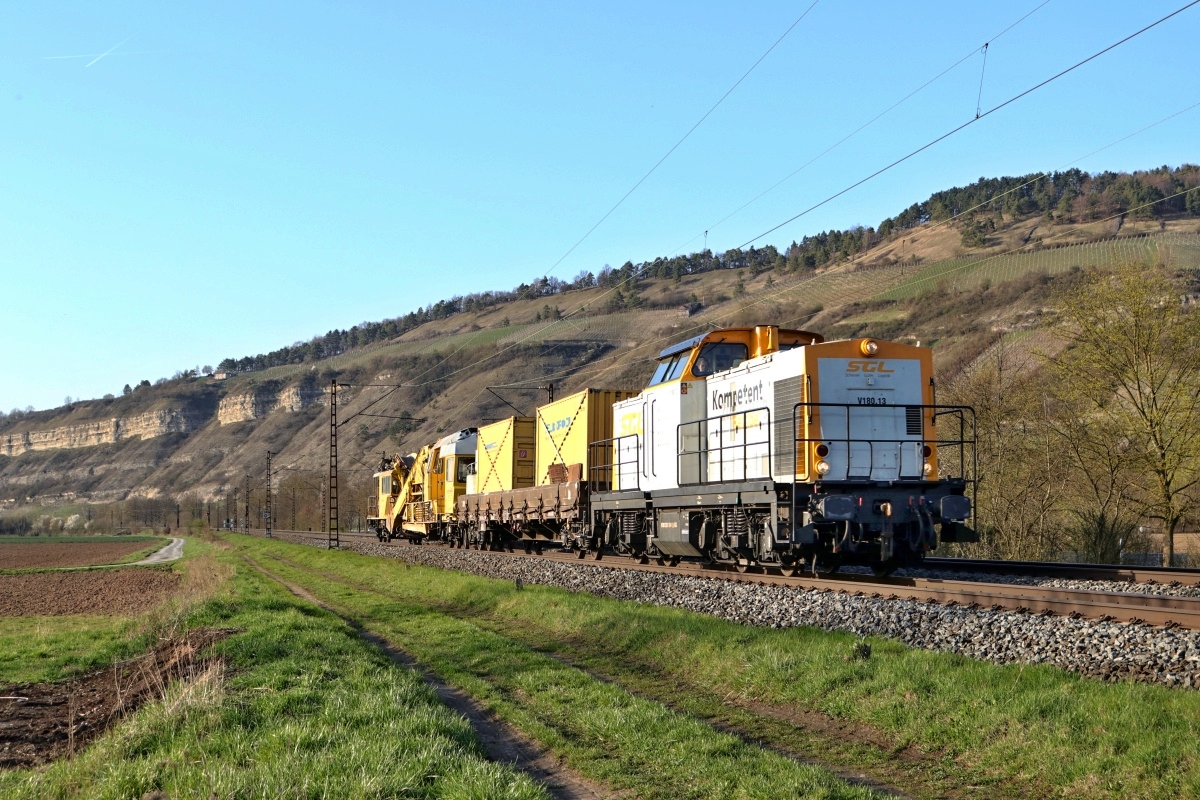 V180.13 -- 203 158-1 (NVR: 92 80 1203 158-1 D-SGL) passierte hier am 08.04.2018 Gambach im Maintal mit einem kleinen Bauzug Rtg. Norden/Gemünden...