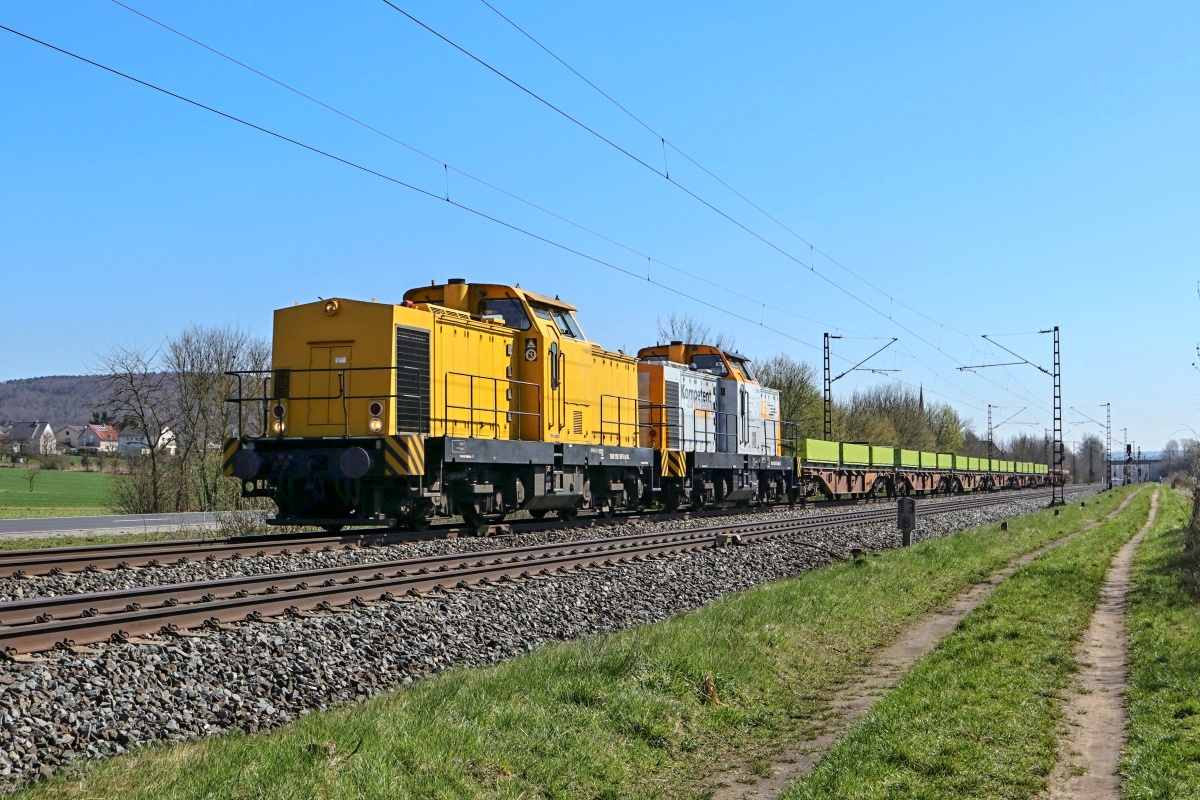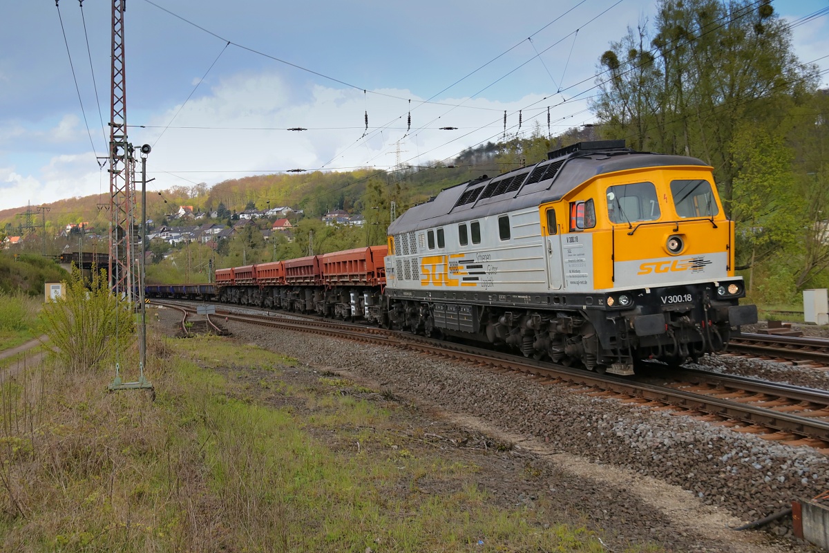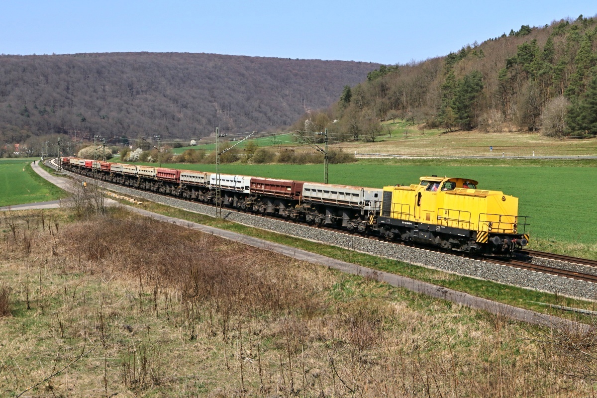 Hier sind 293 507-0 (NVR: 92 80 1293 507-0 D-SGL) und 293 510-4 am 07.04.2018 bei Thüngersheim mit einem Abraumzug Rtg. Norden/Gemünden unterwegs...