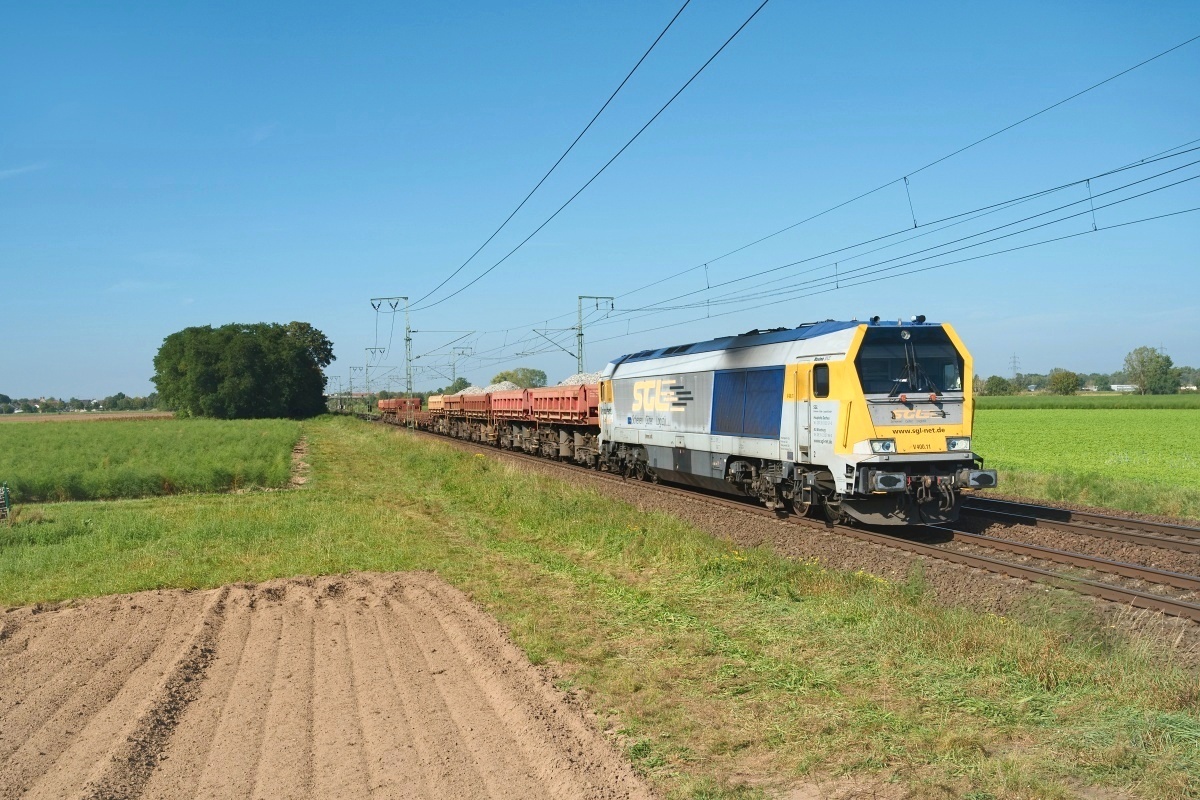 V400.11 -- 263 002-8 (NVR: 92 80 1263 002-8 D-VTLT) war hier am 01.10.2023 bei Klein-Gerau (FKGE) mit einigen mit Neuschotter beladenen Fas