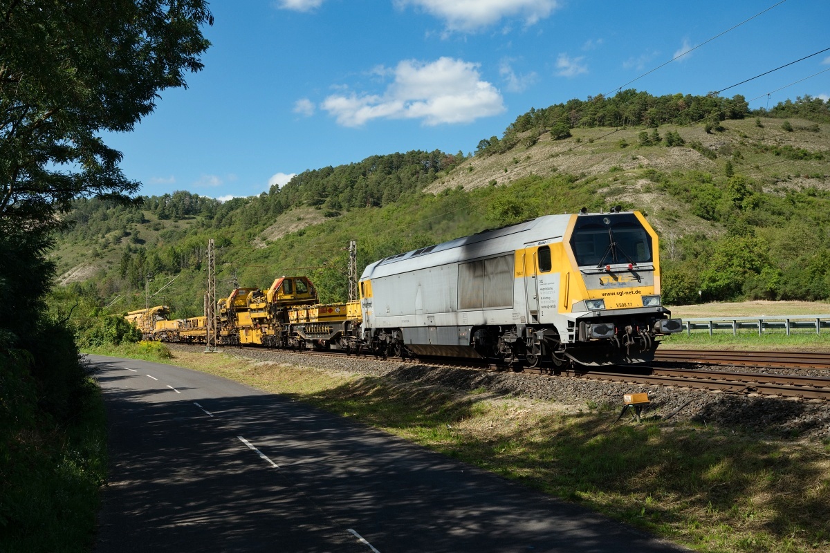 261 313-1 (NVR: 92 80 1261 313-1 D-VTLT) war hier am 09.08.2019 bei Elze mit einem Bauzug Rtg. Norden/Hannover unterwegs...