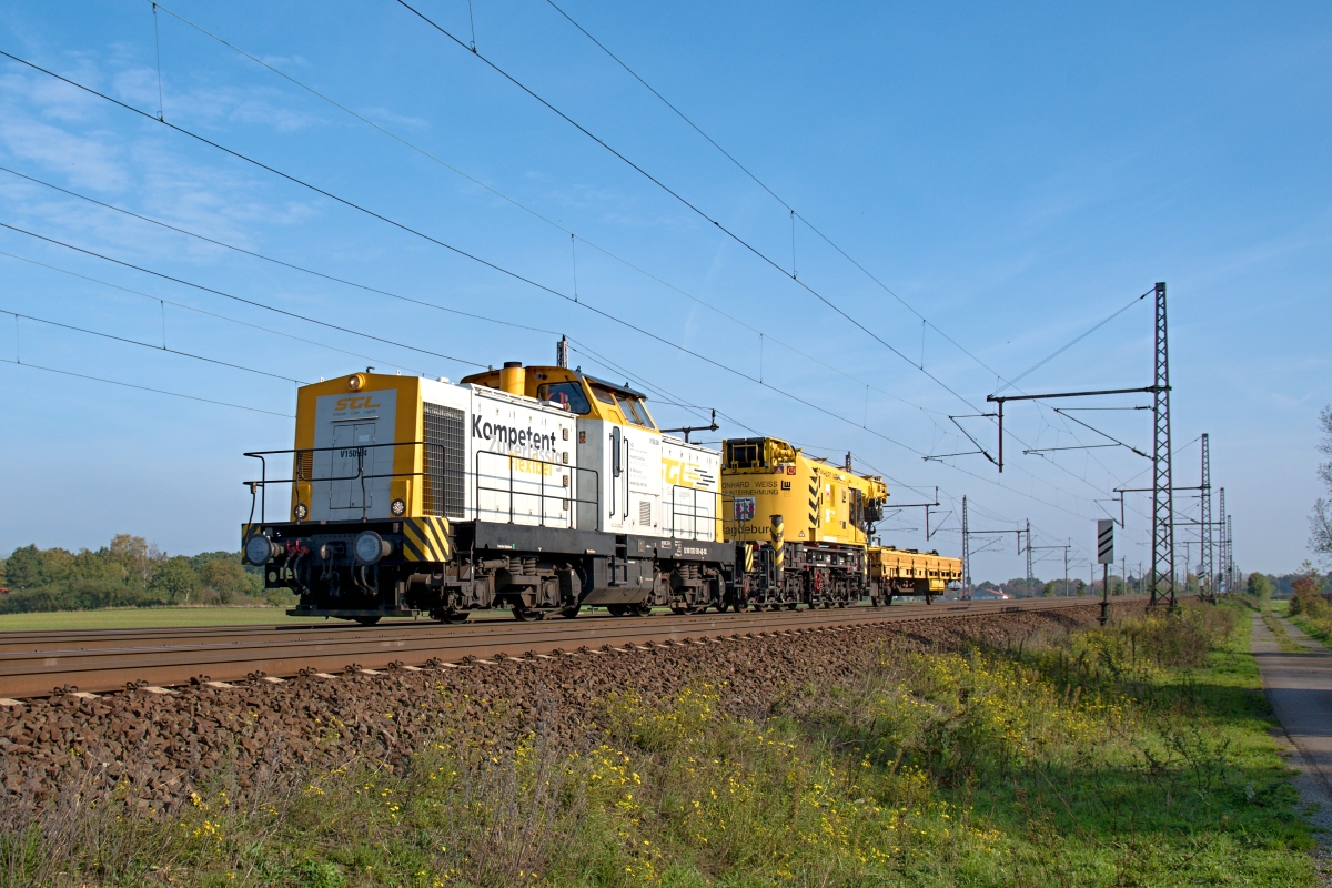 V150.04 -- 293 510-4 (NVR: 92 80 1293 510-4 D-SGL) war hier am 23.10.2019 bei Dedensen-Gümmer mit dem Leonard Weiss Weichenkran (D-EVULW 99 80 9419 020-9)
