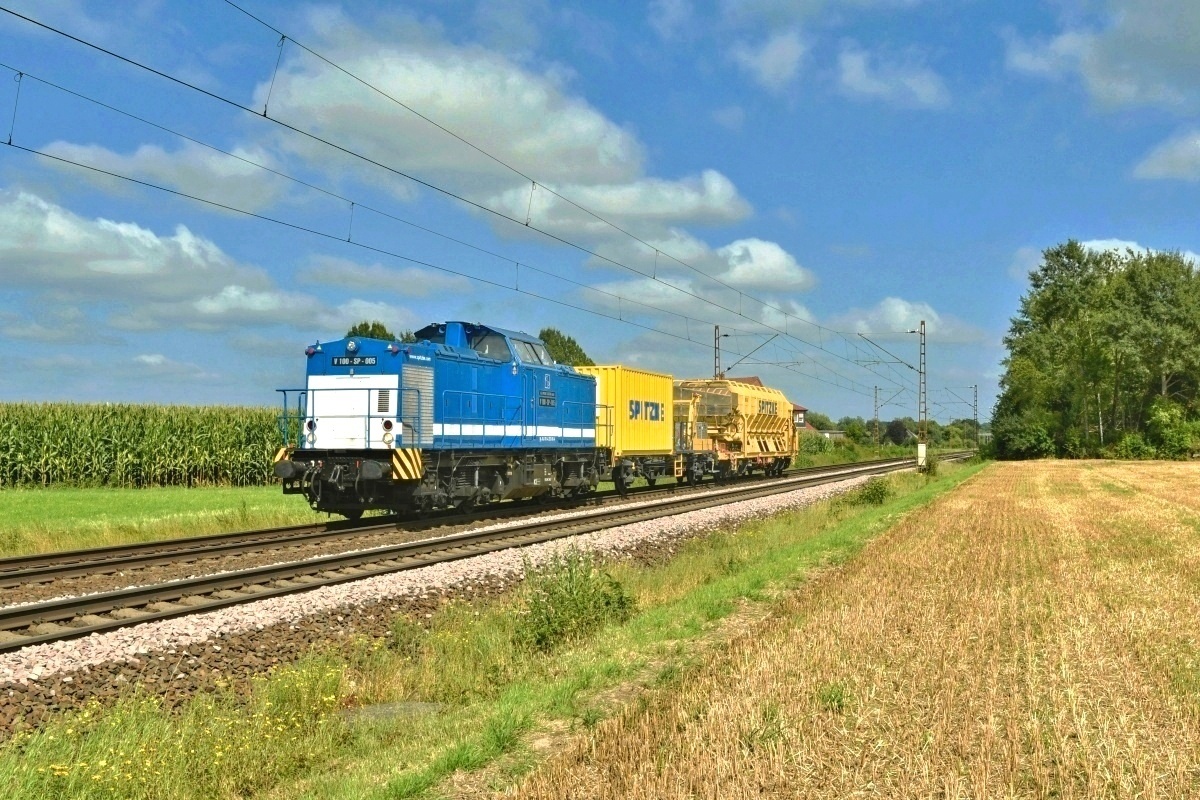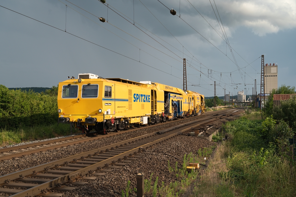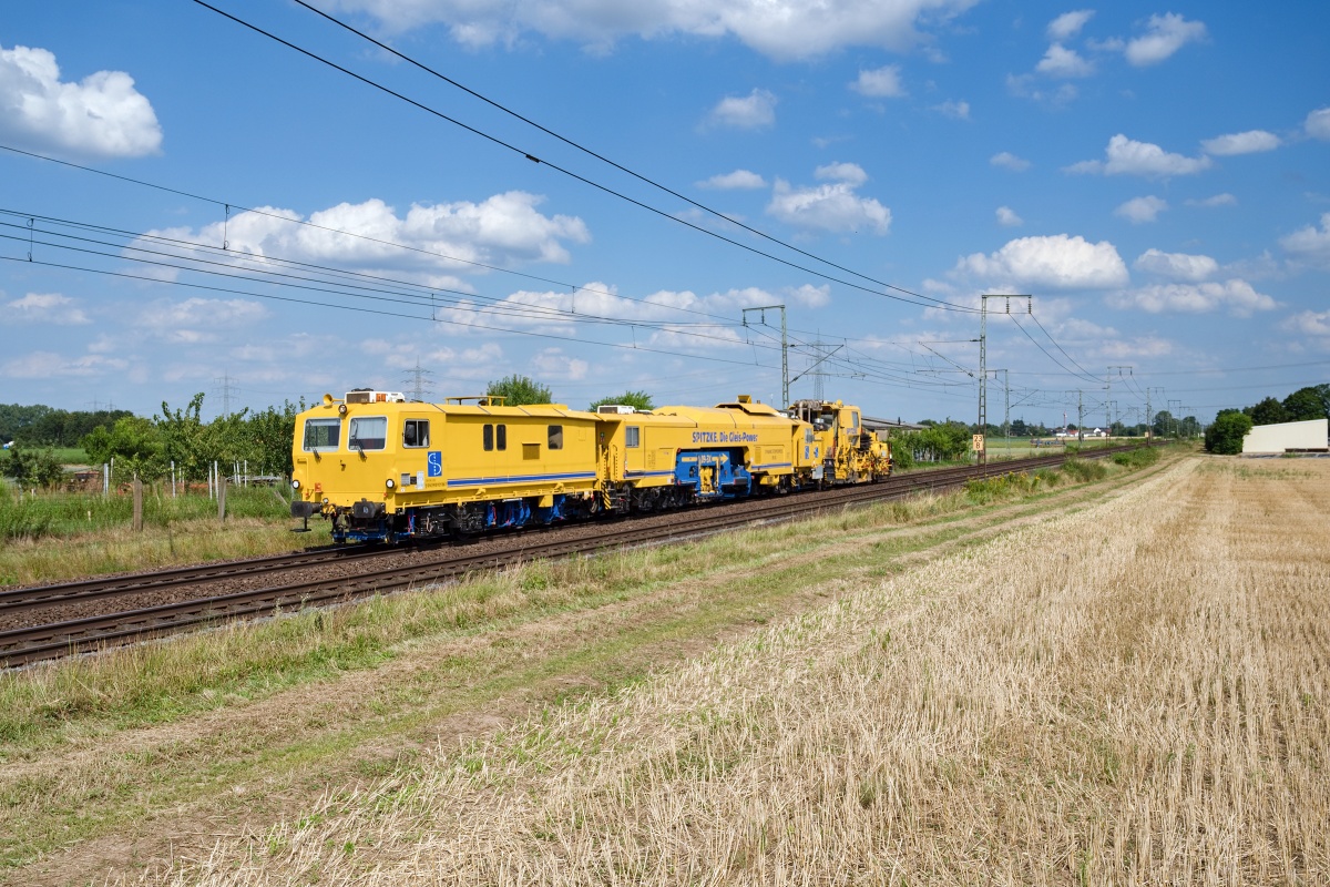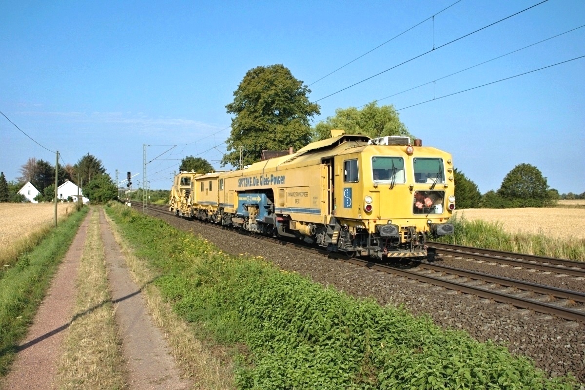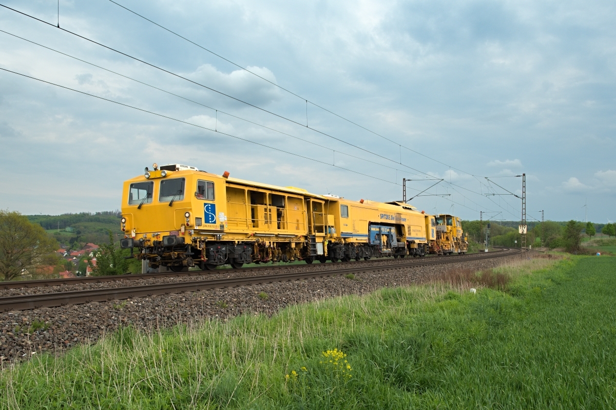 99 80 9121 006-7) mit der Schnellschotterplaniermaschine (D-SPAG