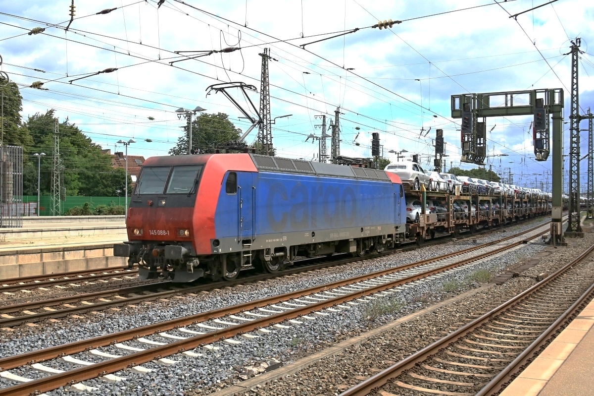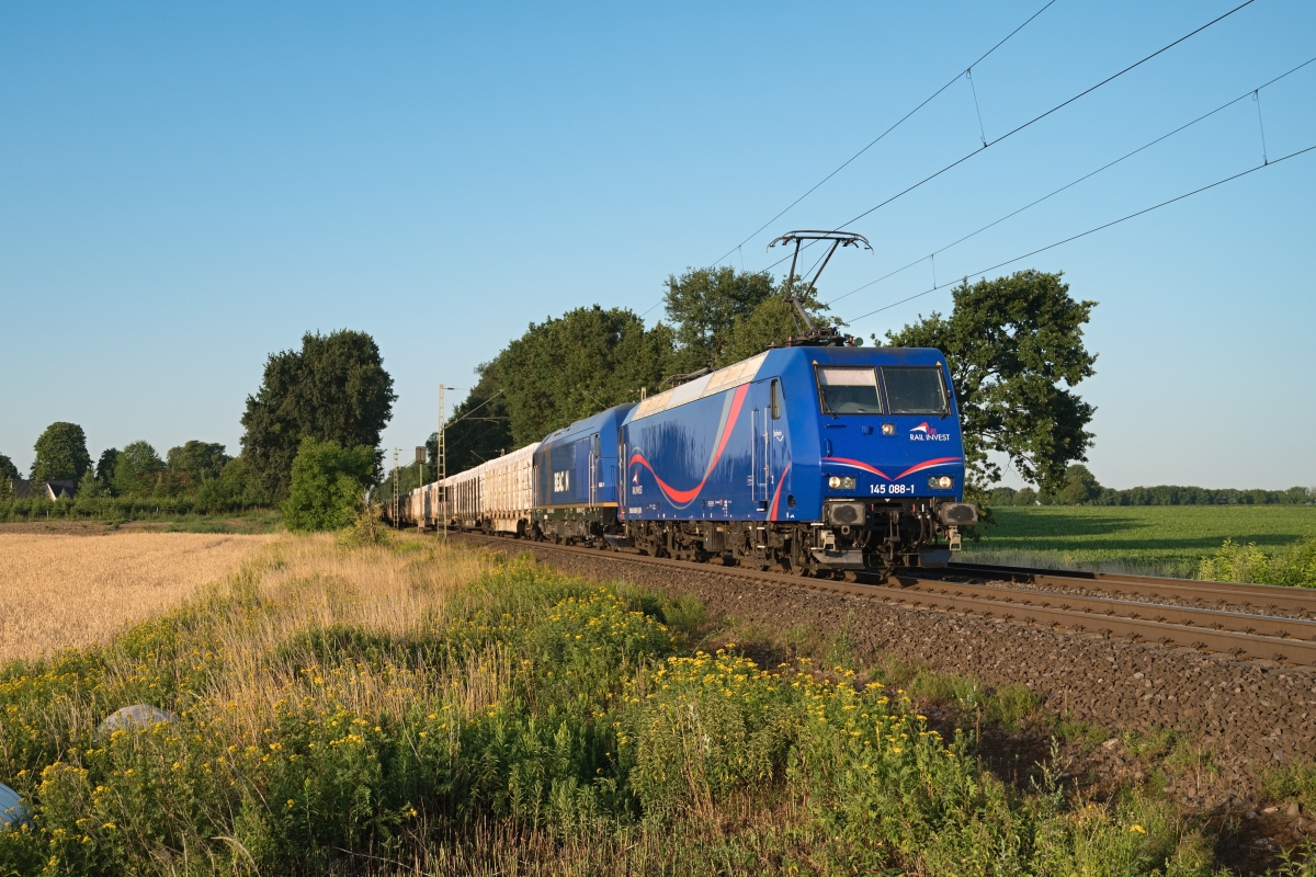 Dto. 145 088-1 im aktuellen Design am 19.07.2022 kurz nach Sonnenaufgang bei